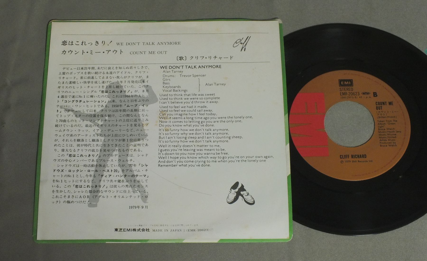 CLIFF RICHARDクリフ・リチャード/WE DON`T TALK ANYMORE恋はこれっきり ! EMR20623 製造国:日本盤 / Media:7inch外観:EX盤の状態:EX+ 価格(税込):¥660 送料 7inch:定形外郵便 360円~LP:定形外郵便 660円~送料は、注文の最終画面で確認頂けます。 レコード検索 > CLASSIC CHAMBER > CLIFF RICHARD/WE DON`T TALK ANYMORE 外観 (EX)特記事項:シミやヨレが少し。外観EXの共通説明:ダメージが限定的。中古品としては保存状態がよい方。シミ、ヨゴレ、スレ 少し~軽度。 盤の状態 (EX+)特記事項:極薄いスリキズ・スレ少し。一見してきれいな状態です。盤EX+の共通説明:盤面の極薄いスリキズ、スレ少し程度 音に出そうなものは無いように見える(極軽微なソフトティック音は除く)。 Tweet それぞれの画像をクリックすると、大きい写真が見られます こちらの商品もお勧めです 1,320円 BRUCE SPRINGSTEENブルース・スプリングスティーン / RIVERリバー 990円 RANDY VANWARMERランディ・ヴァンウォーマー / WARMERアメリカン・モーニング 1,320円 NEIL LAREN二ール・ラーセン / JUNGLE FEVERジャングル・フィーバー 880円 ROBERT PALMERロバート・パーマー / PRIDEプライド 550円 TOM JONESトム・ジョーンズ / LIVE IN LAS VEGASライヴ・イン・ラスヴェガス 770円 ELTON JOHNエルトン・ジョン / DON`T SHOOT ME I`M ONLY THE PIANO PLAYERピアニストを撃つな 660円 ERIC CARMENエリック・カルメン / TONIGHT YOU`RE MINEトゥナイト・ユー・アー・マイン 880円 RUPERT HOLMESルパート・ホルムズ / ADVENTUREアドヴェンチャー