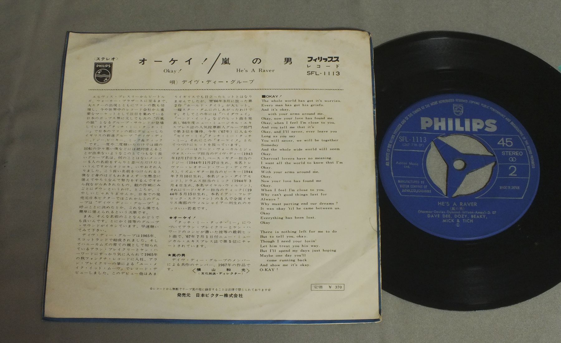DAVE DEE . DOZY. BEAKY. MICK & TICHデイブ・ディー・グループ/OKAY !オーケィ ! SFL1113 製造国:日本盤 / Media:7inch外観:EX-盤の状態:EX- 価格(税込):¥440 送料 7inch:定形外郵便 360円~LP:定形外郵便 660円~送料は、注文の最終画面で確認頂けます。 レコード検索 > QUEEN > DAVE DEE . DOZY. BEAKY. MICK & TICH/OKAY ! 外観 (EX-)特記事項:ヨレやシミ有り。リングスレが少し。外観EX-の共通説明:ダメージ軽度~多少。 中古品としては普通の状態。シミ、ヨゴレ、スレなど軽く~多少。 盤の状態 (EX-)特記事項:薄いスリキズ・細かい表面スレ多少ある感じです。プチ出そうな所は少し。軽微なものが中心の様子です。盤EX-の共通説明:盤面のスリキズが多少有り。音に出そうなものは殆ど無いように見える~さほど気にならないぐらいの軽いプチ数カ所程度。 Tweet それぞれの画像をクリックすると、大きい写真が見られます こちらの商品もお勧めです 4,950円 ANIMALSアニマルズ / BEST ALBUM アニマルズのすべて 赤盤 2,640円 SPOTNICKSスプートニクス / KARELIA-THE BEST OF THE SPOTNICKS霧のカレリア-ベスト・オブ・ザ・スプートニクス