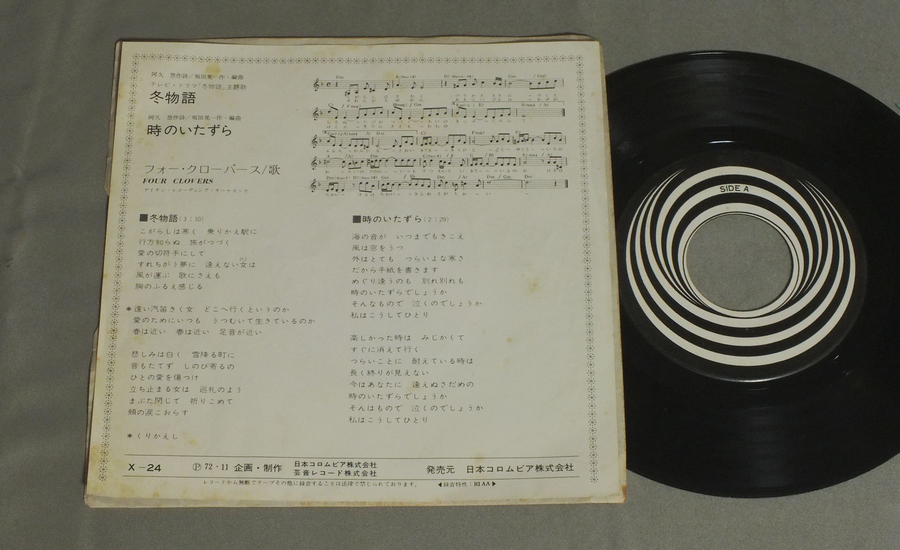 FOUR CLOVERSフォー・クローバース/FUYU MONOGATARI冬物語 X24 製造国:日本盤 / Media:7inch外観:EX盤の状態:EX 価格(税込):¥550 送料 7inch:定形外郵便 360円~LP:定形外郵便 660円~送料は、注文の最終画面で確認頂けます。 レコード検索 > J-POP > FOUR CLOVERS/FUYU MONOGATARI 外観 (EX)特記事項:シミやや有り。外観EXの共通説明:ダメージが限定的。中古品としては保存状態がよい方。シミ、ヨゴレ、スレ 少し~軽度。 盤の状態 (EX)特記事項:薄いスリキズ・スレ軽くある感じ。殆どが軽微なものの様子です。盤EXの共通説明:盤面のスリキズが薄いものが少し~軽度 音に出そうなものは無いように見える(軽微なソフトティック音は除く)。 Tweet それぞれの画像をクリックすると、大きい写真が見られます こちらの商品もお勧めです 990円 TAKASHI SATO佐藤隆 / UN HOMME ET UNE FEMME男と女 2,200円 HIKASUEヒカシュー / SUMMER夏 990円 AMII OZAKI尾崎亜美 / POINTS 770円 TAKURO YOSHIDAよしだたくろう / HELLO! I`M TAKURO YOSHIDA元気です。 770円 I SEONG-AE季成愛 / SAYONARAさよなら - 演歌の源流を探る 770円 REBECCAレベッカ / NOTHING TO LOSEナッシング・トゥ・ルーズ 660円 TULIPチューリップ / MUGEN KIDO無限軌道 770円 MASAMICHI SUGI杉真理 / MISTONE