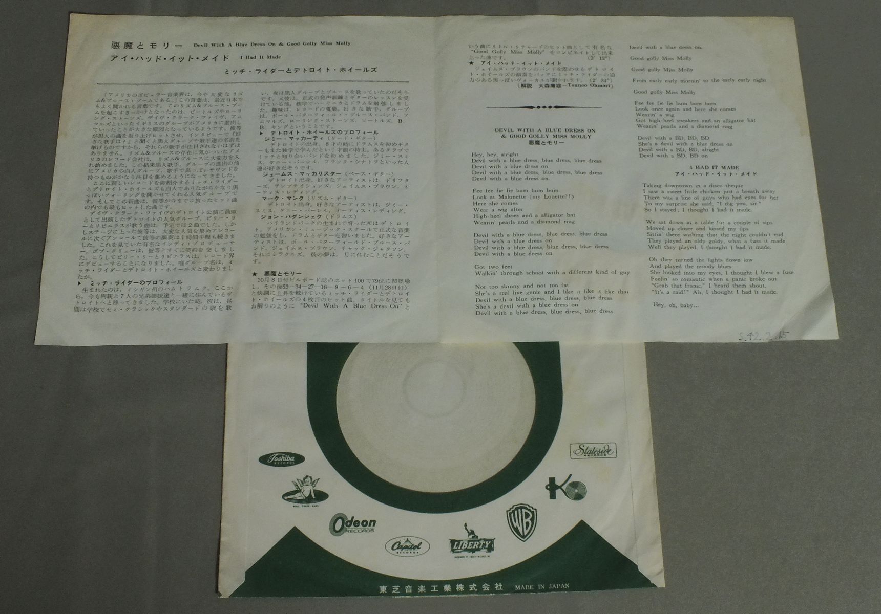 MITCH RYDER AND THE DETROIT WHEELSミッチ・ライダーとデトロイト・ホイールズ/DEVIL WITH A BLUE DRESS ON & GOOD GOLLY MISS MOLLY悪魔とモリー赤盤 SR1635 製造国:日本盤 / Media:7inch外観:VG盤の状態:EX- 価格(税込):¥770 送料 7inch:定形外郵便 360円~LP:定形外郵便 660円~送料は、注文の最終画面で確認頂けます。 > > MITCH RYDER AND THE DETROIT WHEELS/DEVIL WITH A BLUE DRESS ON & GOOD GOLLY MISS MOLLY 外観 (VG)特記事項:背スレやウォーターダメージ有り。裏側にリングスレ。見開きに書込み。外観VGの共通説明:ダメージが見るからに多い。 盤の状態 (EX-)特記事項:薄いスリキズ・細かい表面スレ軽くある感じです。プチ出そうな所は少し。軽微なものが中心の様子です。盤EX-の共通説明:盤面のスリキズが多少有り。音に出そうなものは殆ど無いように見える~さほど気にならないぐらいの軽いプチ数カ所程度。 その他:赤盤 Tweet それぞれの画像をクリックすると、大きい写真が見られます こちらの商品もお勧めです 4,950円 ANIMALSアニマルズ / BEST ALBUM アニマルズのすべて 赤盤 2,640円 SPOTNICKSスプートニクス / KARELIA-THE BEST OF THE SPOTNICKS霧のカレリア-ベスト・オブ・ザ・スプートニクス