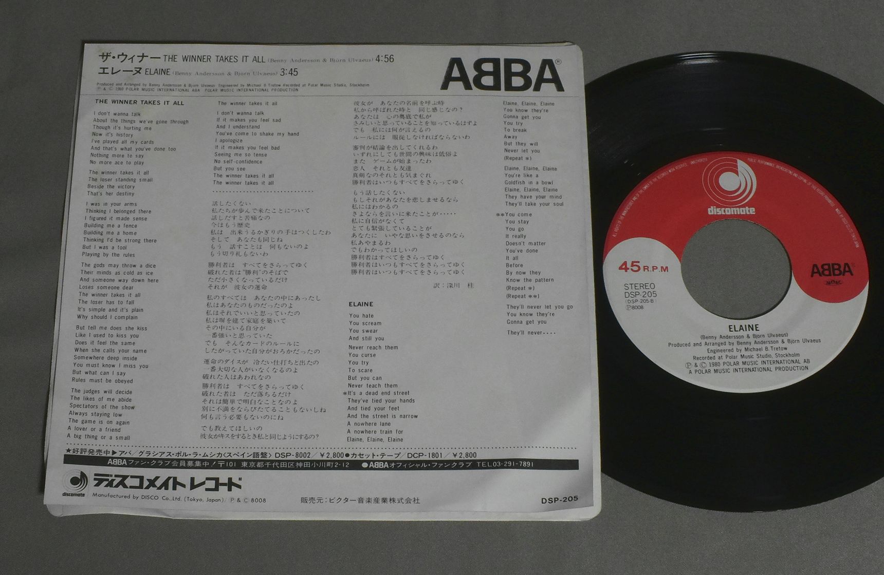 ABBAアバ/WINNER TAKES IT ALLウィナー DSP205 製造国:日本盤 / Media:7inch外観:EX盤の状態:EX+ 価格(税込):¥660 送料 7inch:定形外郵便 360円~LP:定形外郵便 660円~送料は、注文の最終画面で確認頂けます。 レコード検索 > AUDIO CHECK > ABBA/WINNER TAKES IT ALL 外観 (EX)特記事項:ヨレやシミ少々。外観EXの共通説明:ダメージが限定的。中古品としては保存状態がよい方。シミ、ヨゴレ、スレ 少し~軽度。 盤の状態 (EX+)特記事項:極薄いスリキズ・スレ少し。一見してきれいな状態です。盤EX+の共通説明:盤面の極薄いスリキズ、スレ少し程度 音に出そうなものは無いように見える(極軽微なソフトティック音は除く)。 Tweet それぞれの画像をクリックすると、大きい写真が見られます こちらの商品もお勧めです 770円 ABBAアバ / ARRIVALアライバル 1,870円 LOLITA POPロリータ・ポップ / LOLITA POP危険な誘惑 1,210円 ABBAアバ / VOULEZ-VOUSヴーレ・ヴー 1,320円 WHAMワム / MAKE IT BIGメイク・イット・ビッグ 770円 ABBAアバ / VOULEZ-VOUSヴーレ・ヴー 1,210円 DUKESデュークス / 1st ALBUM運命の旅立ち 990円 ABBAアバ / VOULEZ-VOUSヴーレ・ヴー 440円 BAY CITY ROLLERSベイ・シティ・ローラーズ / WOULDN`T YOU LIKE IT ?青春のアイドル