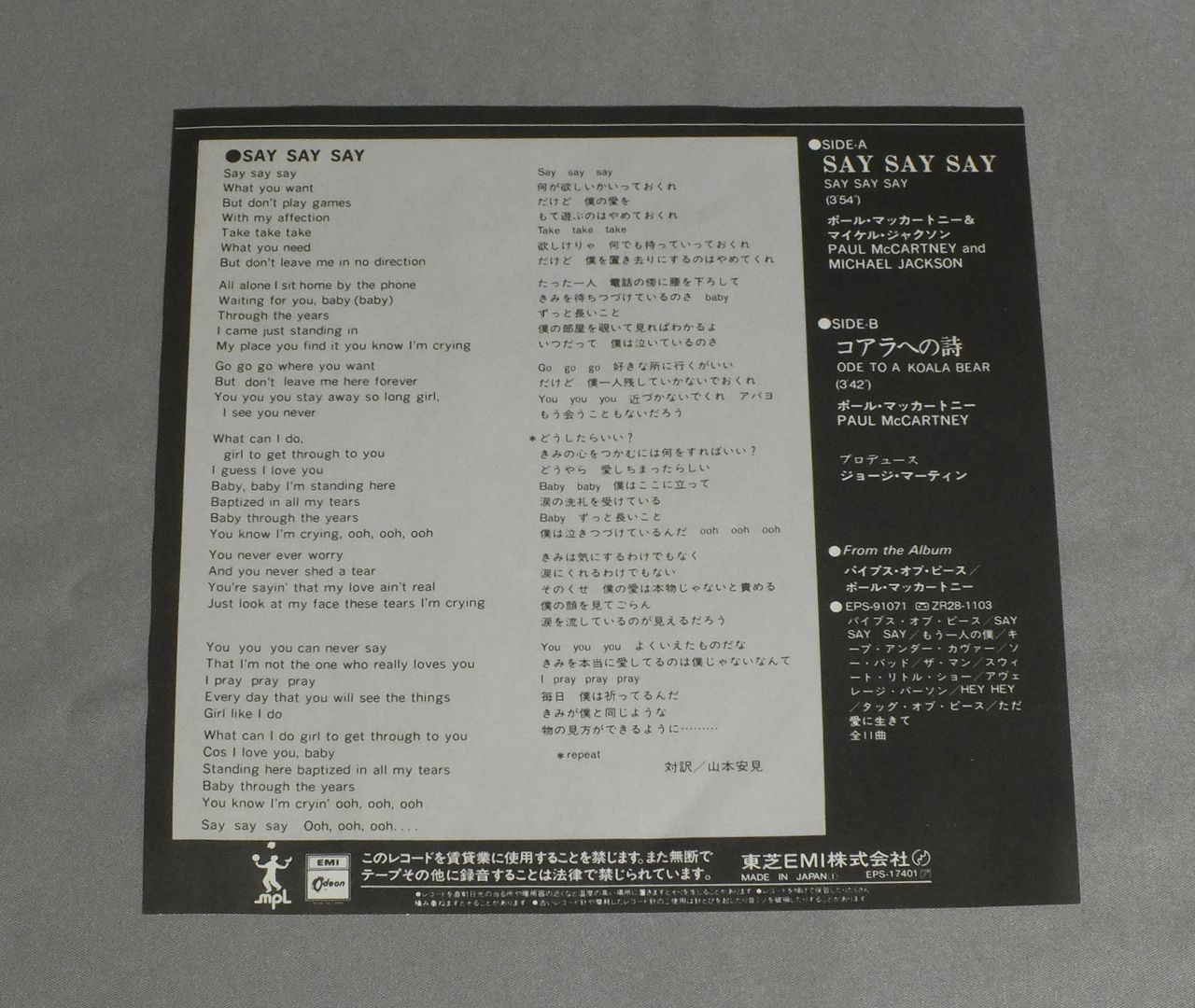 PAUL McCARTNEY & MICHAEL JACKSONポール・マッカートニー&マイケル・ジャクソン/SAY SAY SAY EPS17401 製造国:日本盤 / Media:7inch外観:EX盤の状態:EX 価格(税込):¥660 送料 7inch:定形外郵便 360円~LP:定形外郵便 660円~送料は、注文の最終画面で確認頂けます。 レコード検索 > J-POP > PAUL McCARTNEY & MICHAEL JACKSON/SAY SAY SAY 外観 (EX)特記事項:ヘリスレ有り。外観EXの共通説明:ダメージが限定的。中古品としては保存状態がよい方。シミ、ヨゴレ、スレ 少し~軽度。 盤の状態 (EX)特記事項:薄いスリキズ・スレ軽くある感じ。軽微なものの様子です。盤EXの共通説明:盤面のスリキズが薄いものが少し~軽度 音に出そうなものは無いように見える(軽微なソフトティック音は除く)。 Tweet それぞれの画像をクリックすると、大きい写真が見られます こちらの商品もお勧めです 1,980円 GEORGE HARRISONジョージ・ハリスン / LIVING IN THE MATERIAL WORLDリヴィング・イン・ザ・マテリアル・ワールド 1,210円 WINGSウィングス / VENUS & MARSヴィーナス・アンド・マース 1,540円 WINGSポール・マッカートニーとウイングス / LONDON TOWN 1,650円 PAUL McCARTNEYポール・マッカートニー / PIPES OF PEACEパイプス・オブ・ピース 770円 WINGSポール・マッカートニー&ウイングス / VENUS AND MARSヴィーナス・アンド・マース 880円 PAUL MCCARTNEYポール・マッカートニー / TUG OF WARタッグ・オブ・ウォー 1,320円 WINGSウイングス / WINGS OVER AMERICAウイングス U.S.A.ライヴ!! 770円 JOHN LENNONジョン・レノン / PLASTIC ONO BANDプラスティック・オノ・バンド