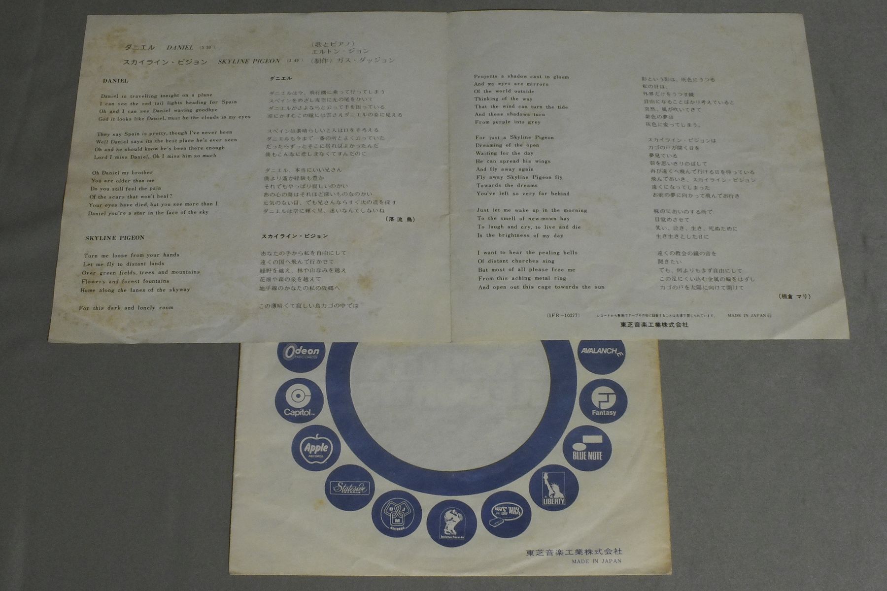 ELTON JOHNエルトン・ジョン/DANIELダニエル IFR10277 製造国:日本盤 / Media:7inch外観:EX-盤の状態:EX 価格(税込):¥770 送料 7inch:定形外郵便 360円~LP:定形外郵便 660円~送料は、注文の最終画面で確認頂けます。 レコード検索 > CLASSIC CHAMBER > ELTON JOHN/DANIEL 外観 (EX-)特記事項:背スレやシミ多め。ヨレ多少有り。外観EX-の共通説明:ダメージ軽度~多少。 中古品としては普通の状態。シミ、ヨゴレ、スレなど軽く~多少。 盤の状態 (EX)特記事項:薄いスリキズ・スレ軽くある感じ。プチ出そうなところは少しだけで、ほとんどが軽微なものの様子です。盤EXの共通説明:盤面のスリキズが薄いものが少し~軽度 音に出そうなものは無いように見える(軽微なソフトティック音は除く)。 Tweet それぞれの画像をクリックすると、大きい写真が見られます こちらの商品もお勧めです 770円 GARY WRIGHTゲイリー・ライト / TOUCH AND GONEタッチ・アンド・ゴーン 1,320円 RAY THOMASレイ・トーマス / FROM MIGHTY OAKS樫の木のファンタジー 1,210円 TACOタコ / LET`S FACE THE MUSICフェイス・ザ・ミュージック 880円 RUPERT HOLMESルパート・ホルムズ / ADVENTUREアドヴェンチャー 990円 JACK BRUCEジャック・ブルース / SONGS FOR A TAILOR真髄 1,210円 ART GARFUNKELアート・ガーファンクル / ANGEL CLAREエンジェル・クレア 1,320円 NEIL DIAMONDニール・ダイアモンド / HOT AUGUST NIGTグリーク・シアター・コンサート 990円 SHAUN CASSIDYショーン・キャシディ / ROOM SERVICEルーム・サーヴィス