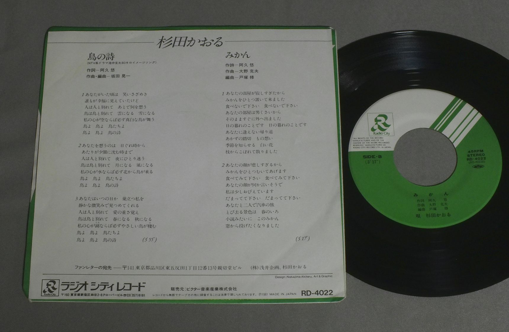 KAORU SUGITA杉田かおる/TORI NO UTA鳥の詩 RD4022 製造国:日本盤 / Media:7inch外観:EX盤の状態:EX 価格(税込):¥550 送料 7inch:定形外郵便 360円~LP:定形外郵便 660円~送料は、注文の最終画面で確認頂けます。 レコード検索 > J-POP > KAORU SUGITA/TORI NO UTA 外観 (EX)特記事項:ヨレ軽く有り。外観EXの共通説明:ダメージが限定的。中古品としては保存状態がよい方。シミ、ヨゴレ、スレ 少し~軽度。 盤の状態 (EX)特記事項:薄いスリキズ・スレ軽くある感じ。軽微なものの様子です。盤EXの共通説明:盤面のスリキズが薄いものが少し~軽度 音に出そうなものは無いように見える(軽微なソフトティック音は除く)。 Tweet それぞれの画像をクリックすると、大きい写真が見られます こちらの商品もお勧めです 880円 YUMI MORIO森尾 由美 / YOU & ME 1,210円 YUKO TOMITAとみたゆう子 / CLASSICAL HEARTクラシカル・ハート 990円 SONOKO KAWAI河合その子 / SIESTAシエスタ 880円 SONOKO KAWAI河合その子 / SONOKOその子 880円 SONOKO KAWAI河合その子 / SONOKOその子 1,210円 MOMOE YAMAGUCH山口百恵 / MOBIUS`S GAMEメビウス・ゲーム 1,210円 ONYANNKO CLUBおニャン子クラブ / DREAM CATALOGUE夢カタログ 770円 NAOKO KAWAI河合奈保子 / NAOKO IN CONCERT河合奈保子 カナリー・コンサート PART 2