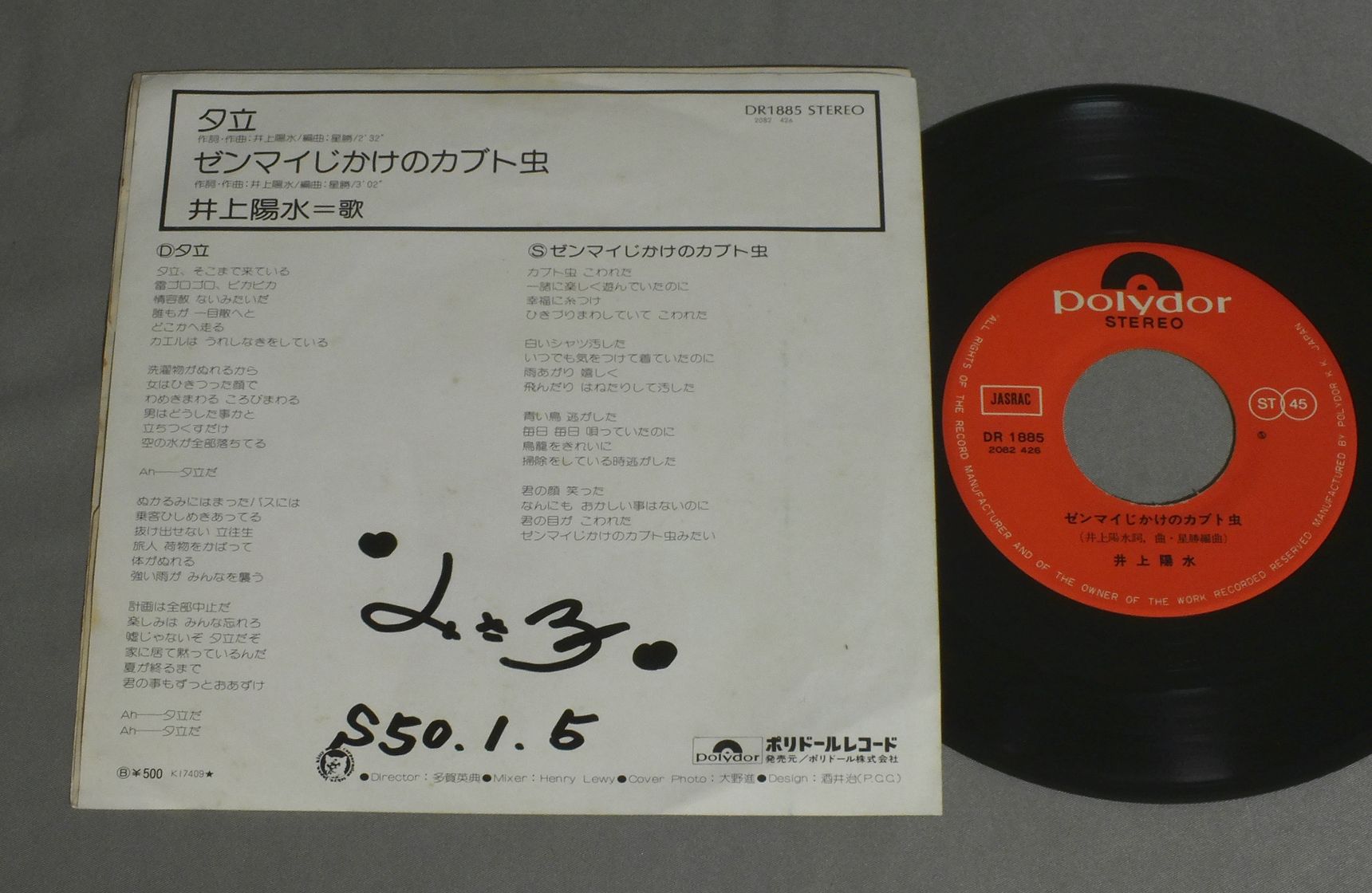 YOSUI INOUE井上陽水/YUDACHI夕立 DR1885 製造国:日本盤 / Media:7inch外観:EX-盤の状態:EX 価格(税込):¥550 送料 7inch:定形外郵便 360円~LP:定形外郵便 660円~送料は、注文の最終画面で確認頂けます。 レコード検索 > 全てのジャンル > YOSUI INOUE/YUDACHI 外観 (EX-)特記事項:裏側に書込みやシミ。外観EX-の共通説明:ダメージ軽度~多少。 中古品としては普通の状態。シミ、ヨゴレ、スレなど軽く~多少。 盤の状態 (EX)特記事項:薄いスリキズ・スレ軽くある感じ。殆どが軽微なものの様子です。盤EXの共通説明:盤面のスリキズが薄いものが少し~軽度 音に出そうなものは無いように見える(軽微なソフトティック音は除く)。 Tweet それぞれの画像をクリックすると、大きい写真が見られます こちらの商品もお勧めです 770円 HIRO TSUNODA & JAP`S GAP`Sつのだ・ひろ&ジャップス・ギャップス / 1st ALBUMジャップス・ギャップス・テーマ 1,210円 HIROMI OHTA太田裕美 / TEDUKURI NO GASHUU手作りの画集 440円 YASUHIRO SUZUKI鈴木康博 / SINCERELY 440円 MANABU MIYAHARA宮原学 / READY STEADY GO 770円 YOSHIMI IWASAKI岩崎良美 / KUCHIBIRU NI YUMENO ATO唇に夢の跡 770円 YOSHITAROU KANAZAKI加奈崎芳太郎 (古井戸) / AIGA MOSHI SUBETENARA愛がもしすべてなら 770円 KEIKO MARUYAMA丸山圭子 / HARU-SHIGURE春しぐれ 770円 TAKURO YOSHIDA吉田拓郎 / OHINARU HITO大いなる人