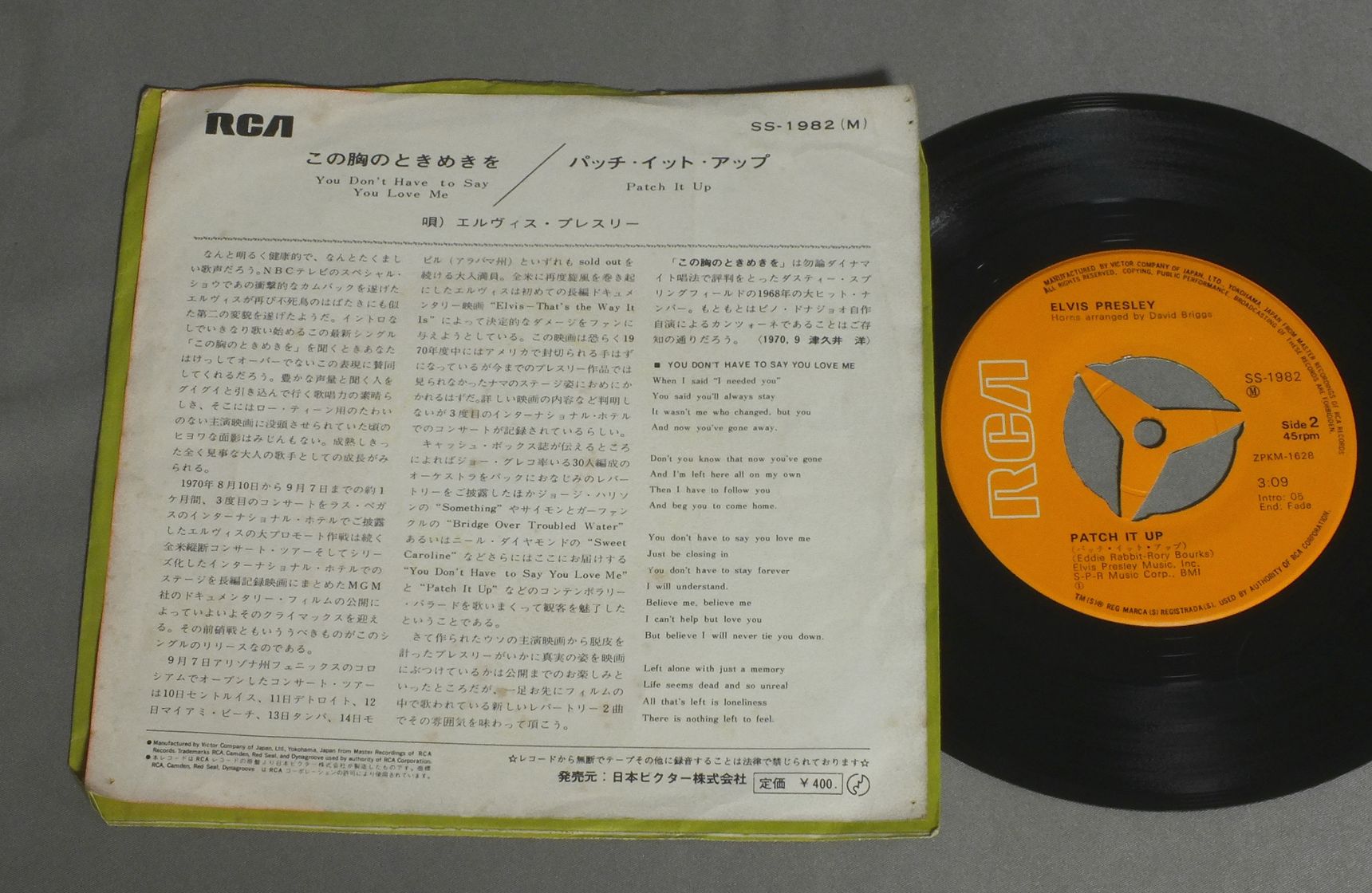 ELVIS PRESLEYエルヴィス・プレスリー/YOU DON`T HAVE TO SAY YOU LOVE MEこの胸のときめきを SS1982 製造国:日本盤 / Media:7inch外観:VG+盤の状態:EX- 価格(税込):¥550 送料 7inch:定形外郵便 360円~LP:定形外郵便 660円~送料は、注文の最終画面で確認頂けます。 レコード検索 > FEMALE > ELVIS PRESLEY/YOU DON`T HAVE TO SAY YOU LOVE ME 外観 (VG+)特記事項:角にピン穴。ヨレやシミが少し。外観VG+の共通説明:ダメージやや有り。シミ、ヨゴレ、スレなど多少~やや多め。 盤の状態 (EX-)特記事項:薄いスリキズ・細かい表面スレ軽くある感じです。プチ出そうな所は少し。軽微なものが中心の様子です。盤EX-の共通説明:盤面のスリキズが多少有り。音に出そうなものは殆ど無いように見える~さほど気にならないぐらいの軽いプチ数カ所程度。 Tweet それぞれの画像をクリックすると、大きい写真が見られます こちらの商品もお勧めです 440円 VENTURESベンチャーズ / POPS IN JAPANポップス・イン・ジャパン 770円 VARIOUS ARTISTS / YESTERDAY`S HITSイエスタデイズ・ヒッツ 1,210円 EVERLY BROTHERSエヴァリー・ブラザース / DATE WITH EVERY BROTHERSデイト・ウィズ・エヴァリー・ブラザーズ 990円 RICK NELSONリック・ネルソン / ALBUM SEVEN BY RICKアルバム・セブン・バイ・リック 1,210円 ELVIS PRESLEY / ON STAGE FEBRUARY 1970プレスリー・オン・ステージ 1970 1,650円 ELVIS PLESLEYエルヴィス.プレスリー / ELVIS-THAT`S THE WAY IT ISエルヴィス.オン・ステージVOL.1 880円 VENTURESベンチャーズ / JOYジョイ -ディスカバー・クラシック- 770円 WANDA JACKSONワンダ・ジャクスン / WANDA JACKSON COUNTRY !ワンダ・ジャクスン・カントリー