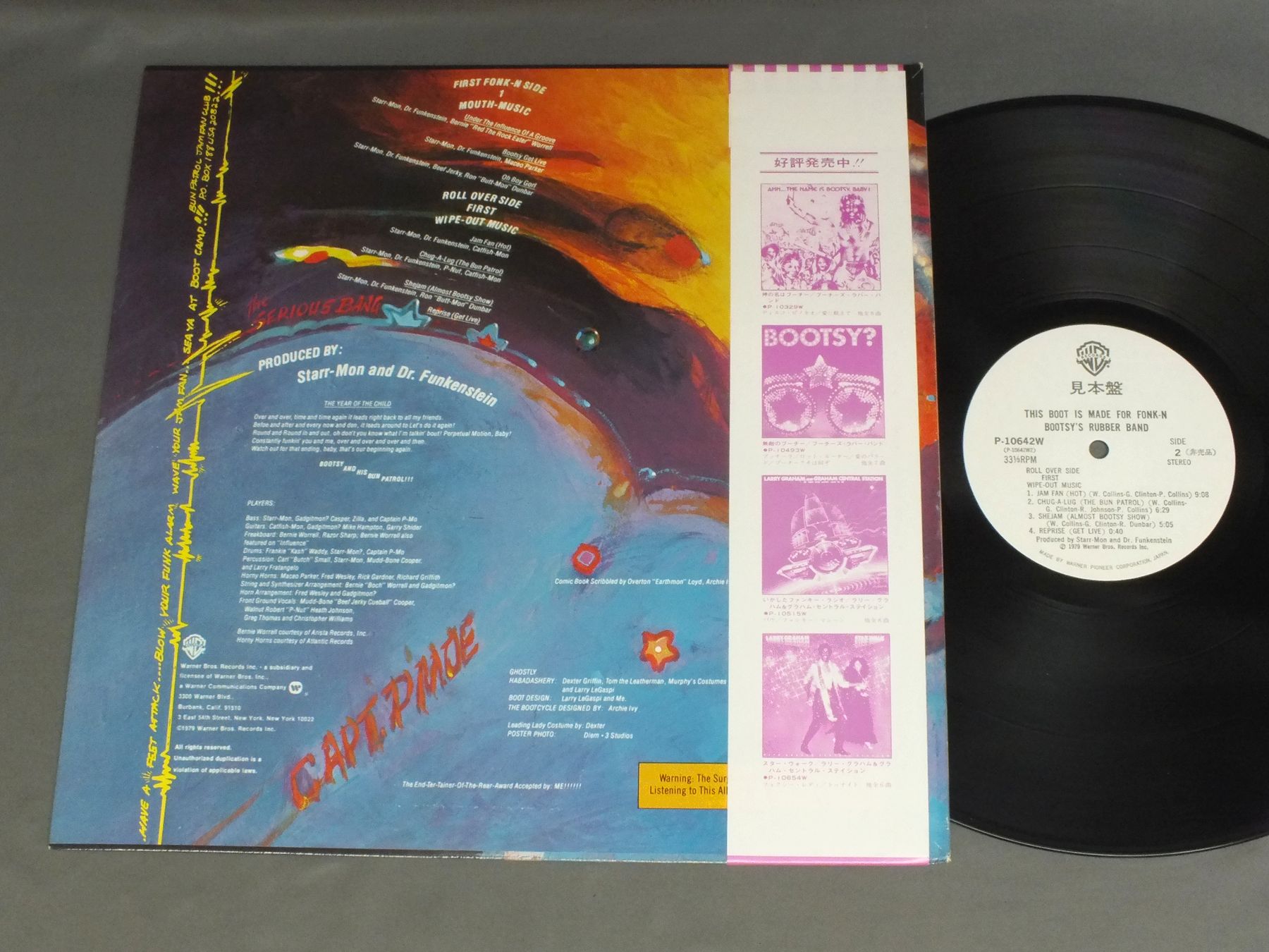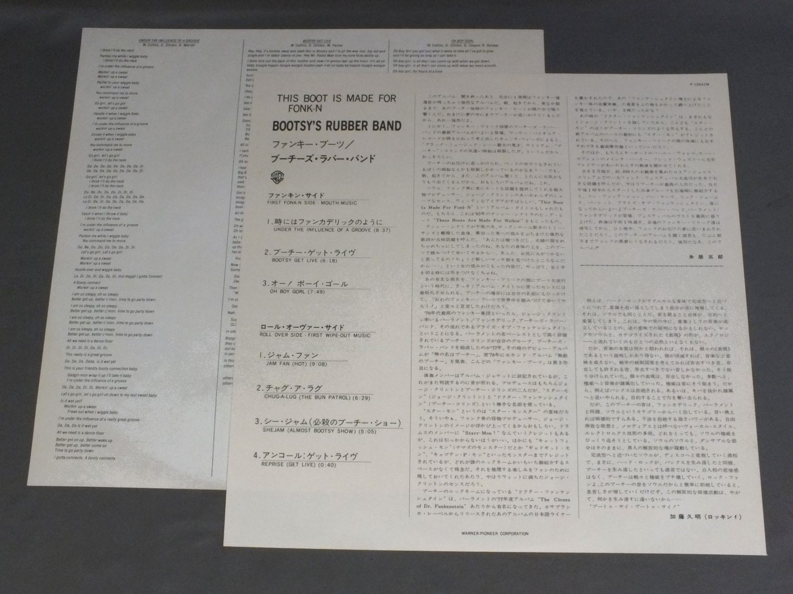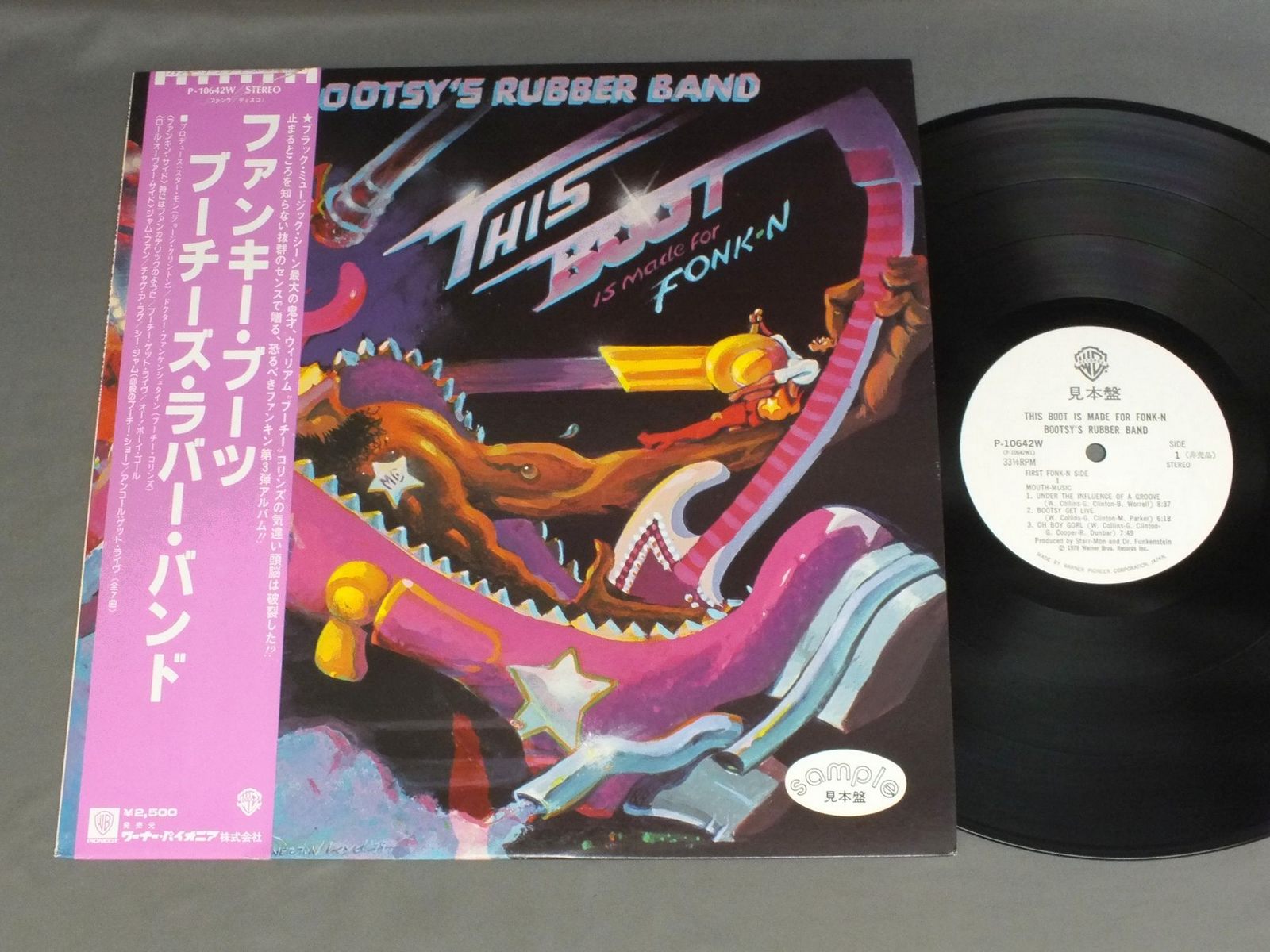 BOOTSY`S RUBBER BANDブーチーズ・ラバー・バンド/THIS BOOT IS MADE FOR FONK-Nファンキー・ブーツ P10642W 製造国:日本盤 / Media:LP外観:EX+盤の状態:EX+帯:EX+ 価格(税込):¥3,740(売約済) 送料 7inch:定形外郵便 360円~LP:定形外郵便 660円~送料は、注文の最終画面で確認頂けます。 レコード検索 > CLASSIC CHAMBER > BOOTSY`S RUBBER BAND/THIS BOOT IS MADE FOR FONK-N 外観 (EX+)特記事項:特記なし。外観EX+の共通説明:中古としては美品、一見してきれいでダメージが軽微。シミ、ヨゴレ、スレ有っても僅か~少し。 盤の状態 (EX+)特記事項:極薄いスリキズ・スレ少し。一見してきれいな状態です。盤EX+の共通説明:盤面の極薄いスリキズ、スレ少し程度 音に出そうなものは無いように見える(極軽微なソフトティック音は除く)。 帯の状態 (EX+):下ヘリに僅かに切れ その他:白見本盤 Tweet それぞれの画像をクリックすると、大きい写真が見られます こちらの商品もお勧めです 990円 STEVIE WONDERスティービー・ワンダー / SECRET LIFE OF PLANTSシークレット・ライフ 1,210円 DRAMATICSドラマティックス / 10 1/2テン・アンド・ハーフ 1,320円 RAY PARKER JRレイ・パーカーJR / AFTER DARKアフター・ダーク 1,320円 STAX - VOLT LABL SOUL / LIVE IN PARISソウル・エクスプロージョン ライヴ・イン・パリ 1,210円 TEDDY PENDERGRASSテディ・ペンダーグラス / TEDDY LIVE ! COAST TO COASTライブ!コースト・トゥ・コースト 770円 SMILEY LEWISスマイリー・ルイス / I HEAR YOU KNOCKINGアイ・ヒア・ユー・ノッキン 880円 GLADYS KNIGHT & THE PIPSグラディス・ナイト&ザ・ピップス / I FEEL A SONGアイ・フィール・ア・ソング 880円 THREE DEGREESスリー・ディグリーズ / INTERNATIONAL THREE DEGREES世界の恋人・スリー・ディグリーズ