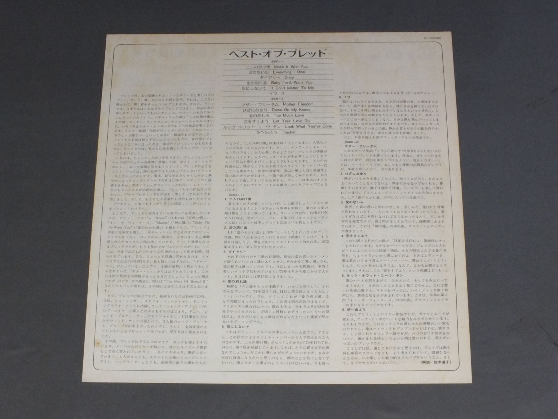 BREADブレッド/BEST OF BREADベスト・オブ・ブレッド P10338E 製造国:日本盤 / Media:LP外観:EX-盤の状態:EX+帯:EX 価格(税込):¥880(売約済) 送料 7inch:定形外郵便 360円~LP:定形外郵便 660円~送料は、注文の最終画面で確認頂けます。 レコード検索 > JAZZ > BREAD/BEST OF BREAD 外観 (EX-)特記事項:見開きも含めてシミ有り。外観EX-の共通説明:ダメージ軽度~多少。 中古品としては普通の状態。シミ、ヨゴレ、スレなど軽く~多少。 盤の状態 (EX+)特記事項:極薄いスリキズ・スレ少し。一見してきれいな状態です。盤EX+の共通説明:盤面の極薄いスリキズ、スレ少し程度 音に出そうなものは無いように見える(極軽微なソフトティック音は除く)。 帯の状態 (EX):特記なし。 Tweet それぞれの画像をクリックすると、大きい写真が見られます こちらの商品もお勧めです 660円 SUZI QUATRO / SUZI QUATRO STORY GOLDEN HITS 990円 TONY ORLANDO & DAWNトニー・オーランド&ドーン / HE DON`T LOVE YOU(LIKE I LOVE YOU)恋のシーソー・ゲーム 880円 SANTANAサンタナ / SANTANAサンタナのすべて 770円 STYXスティクス / BEST OF STYXレディ ( スティクス・ベスト ) 770円 REO SPEEDWAGONREO スピードワゴン / HI INFIDELITY禁じられた夜 770円 STYXスティクス / CORNERSTONEコーナーストーン 1,210円 EAGLESイーグルス / LONG RUNザ・ロング・ラン 1,210円 DEVADIP CARLOS SANTANAカルロス・サンタナ / SWING OF DELIGHTスイング・オブ・ディライト