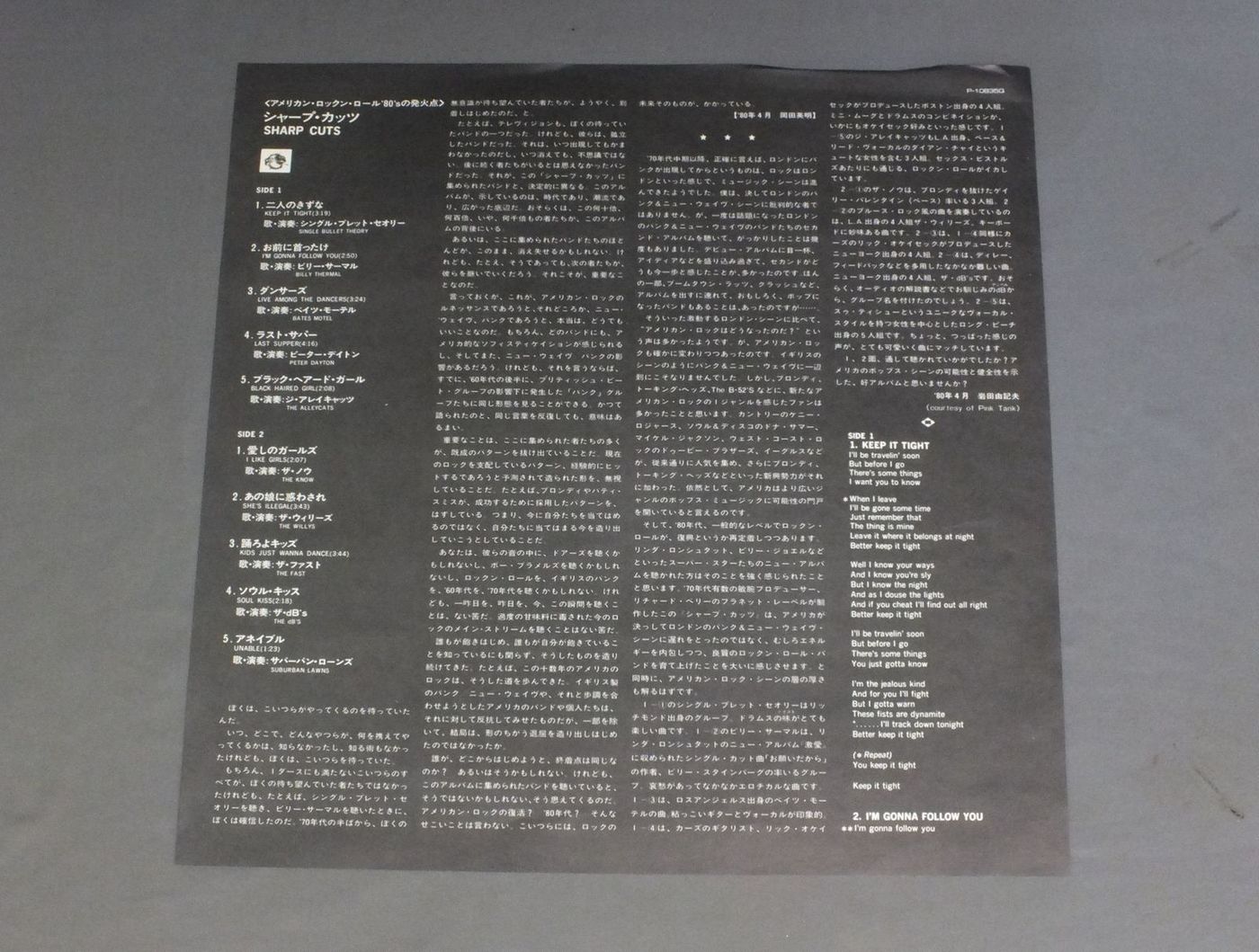 SINGLE BULLET THEORY ALLYCATS SUBURBAN LAWNS etcシングル・ブレッド・セオリー 他/SHARP CUTSシャープ・カッツ/アメリカン・ロックン・ロール`80`Sの発火点 P10835Q 製造国:日本盤 / Media:LP外観:EX盤の状態:EX+ 価格(税込):¥2,332(売約済) 送料 7inch:定形外郵便 360円~LP:定形外郵便 660円~送料は、注文の最終画面で確認頂けます。 > > SINGLE BULLET THEORY ALLYCATS SUBURBAN LAWNS etc/SHARP CUTS 外観 (EX)特記事項:特記なし。外観EXの共通説明:ダメージが限定的。中古品としては保存状態がよい方。シミ、ヨゴレ、スレ 少し~軽度。 盤の状態 (EX+)特記事項:極薄いスリキズ・スレ少し。一見してきれいな状態です。盤EX+の共通説明:盤面の極薄いスリキズ、スレ少し程度 音に出そうなものは無いように見える(極軽微なソフトティック音は除く)。 その他:見本盤 Tweet それぞれの画像をクリックすると、大きい写真が見られます こちらの商品もお勧めです 770円 CULTURE CLUB / KISSING TO BE CLEVER 1,320円 DEAD OR ALIVEデッド・オア・アライヴ / YOUTHQUAKEユースクエイク 1,320円 KEVIN ROWL & DEXYS MIDNIGHT RUNNERSテキシーズ・ミッドナイト・ランナーズ / TOO-RYE-AY女の泪はワザモンだ!! 1,320円 ADAM AND THE ANTSアダム&ジ・アンツ / KINGS OF THE WILD FRONTIERアダムの王国 880円 SNIFF `N` THE TEARSスニッフ&ザ・ティアーズ / LOVE ACTION夜の眩暈 1,320円 ELVIS COSTELLOエルヴィス・コステロ / GOODBYE CRUEL WORLDグッバイ・クルエル・ワールド 440円 TUBESチューブス / OUTSIDE INSIDEアウトサイド・インサイド 1,650円 BLONDIEブロンディ / EAT TO THE BEAT恋のハートビート