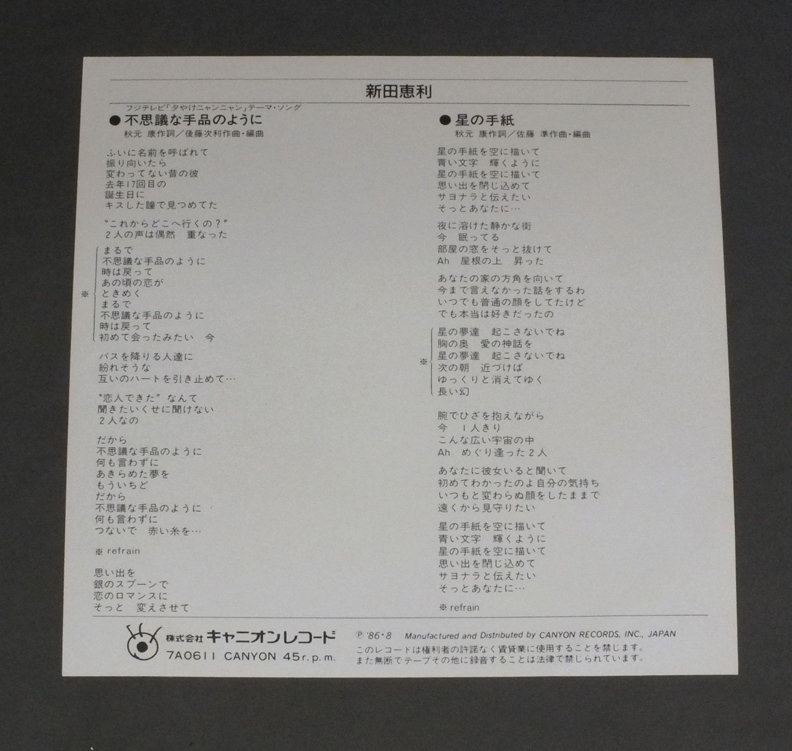 ERI NITTA新田恵利/FUCHIGINA TEJINA NO YOUNI不思議な手品のように 7A0611 製造国:日本盤 / Media:7inch外観:EX盤の状態:EX+ 価格(税込):¥660 送料 7inch:定形外郵便 360円~LP:定形外郵便 660円~送料は、注文の最終画面で確認頂けます。 レコード検索 > PROGRESSIVE > ERI NITTA/FUCHIGINA TEJINA NO YOUNI 外観 (EX)特記事項:特記なし。外観EXの共通説明:ダメージが限定的。中古品としては保存状態がよい方。シミ、ヨゴレ、スレ 少し~軽度。 盤の状態 (EX+)特記事項:極薄いスリキズ・スレ少し。一見してきれいな状態です。盤EX+の共通説明:盤面の極薄いスリキズ、スレ少し程度 音に出そうなものは無いように見える(極軽微なソフトティック音は除く)。 Tweet それぞれの画像をクリックすると、大きい写真が見られます こちらの商品もお勧めです 770円 NAOKO KAWAI河合奈保子 / NAOKO IN CONCERT河合奈保子 カナリー・コンサート PART 2 990円 PINK LADYピンク・レディー / BYE BYE CARNIVALバイ・バイ・カーニバル 770円 YOSHIE KASHIWABARA柏原よしえ / SUMMER SENSATIONサマー・センセイション 990円 SONOKO KAWAI河合その子 / SIESTAシエスタ 880円 YUMI MORIO森尾 由美 / YOU & ME 990円 YOSHIMI IWASAKI岩崎良美 / SAISONS (2nd ALBUM)セゾン(2nd ALBUM) 1,210円 ONYANKO CLUB河合その子 国生さゆり 城之内早苗 渡辺美奈子 渡辺満里奈 / MERRY X`MAS FOR YOU PICTURE DISCメリー・クリスマス・フォー・ユー 880円 MAKO ISHINO石野真子 / MAKO2