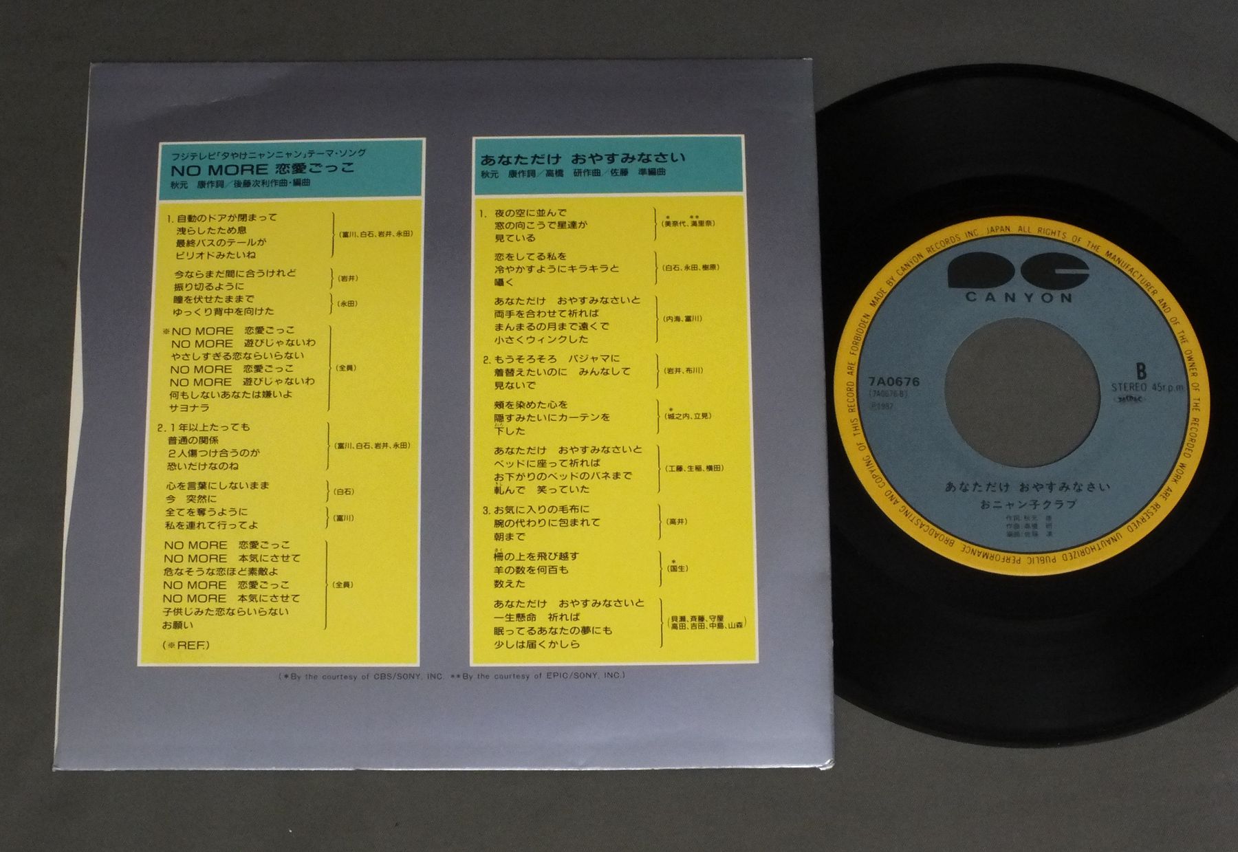 ONYANKO CLUBおニャン子クラブ/NO MORE RENNAI GOKKONO MORE 恋愛ごっこ 7A0676 製造国:日本盤 / Media:7inch外観:EX盤の状態:EX+ 価格(税込):¥660 送料 7inch:定形外郵便 360円~LP:定形外郵便 660円~送料は、注文の最終画面で確認頂けます。 レコード検索 > J-POP > ONYANKO CLUB/NO MORE RENNAI GOKKO 外観 (EX)特記事項:特記なし。外観EXの共通説明:ダメージが限定的。中古品としては保存状態がよい方。シミ、ヨゴレ、スレ 少し~軽度。 盤の状態 (EX+)特記事項:極薄いスリキズ・スレ少し。一見してきれいな状態です。盤EX+の共通説明:盤面の極薄いスリキズ、スレ少し程度 音に出そうなものは無いように見える(極軽微なソフトティック音は除く)。 Tweet それぞれの画像をクリックすると、大きい写真が見られます こちらの商品もお勧めです 550円 ONYANKO CLUBおニャン子クラブ / KICK OFFキックオフ 770円 ERI NITTA新田恵利 / E-AREA 880円 MAKO ISHINO石野真子 / HOHOEMI微笑 770円 ONYANKO CLUBおニャン子クラブ / CIRCLEサークル 1,210円 SONOKO KAWAI河合その子 / SIESTAシエスタ 770円 SHOKO SAWADA沢田聖子 / YUMENO KATACHI夢のかたち 770円 MIKI ASAKURA麻倉末稀 / LOVE AGAIN 880円 SONOKO KAWAI河合その子 / SONOKOその子