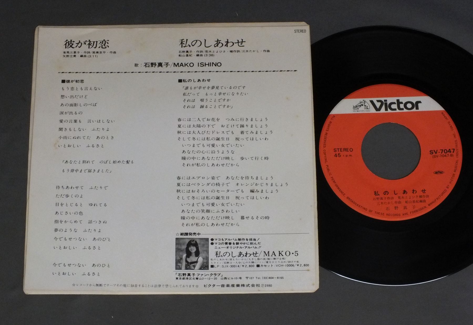 MAKO ISHINO石野真子/HAREGA HATUKOI彼が初恋 SV7047 製造国:日本盤 / Media:7inch外観:EX盤の状態:EX 価格(税込):¥550 送料 7inch:定形外郵便 360円~LP:定形外郵便 660円~送料は、注文の最終画面で確認頂けます。 レコード検索 > J-POP > MAKO ISHINO/HAREGA HATUKOI 外観 (EX)特記事項:裏ジャケ側にシミ有り外観EXの共通説明:ダメージが限定的。中古品としては保存状態がよい方。シミ、ヨゴレ、スレ 少し~軽度。 盤の状態 (EX)特記事項:薄いスリキズ・スレ軽くある感じ。軽微なものの様子です。盤EXの共通説明:盤面のスリキズが薄いものが少し~軽度 音に出そうなものは無いように見える(軽微なソフトティック音は除く)。 Tweet それぞれの画像をクリックすると、大きい写真が見られます こちらの商品もお勧めです 880円 YUMI MORIO森尾 由美 / YOU & ME 1,320円 PINK LADYピンク・レディー / PINK LADY-SUMMER FIRE `77ピンク・レディー-サマー・ファイア `77 770円 YUKO ISHIKAWA石川優子 / REN`AI-KODOKU-JIN恋愛孤独人 990円 YOU HAYAMI早見優 / RECESSリーセス 770円 SHOKO SAWADA沢田聖子 / SHOKO LIVE 770円 YUKO ISHIKAWA石川優子 / REN`AI KODOKU-JIN恋愛孤独人 880円 MAKO ISHINO石野真子 / HOHOEMI微笑 1,210円 AKINA NAKAMORI中森明菜 / FANTASYファンタジー`幻想曲`