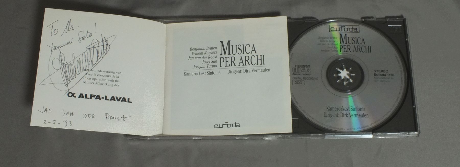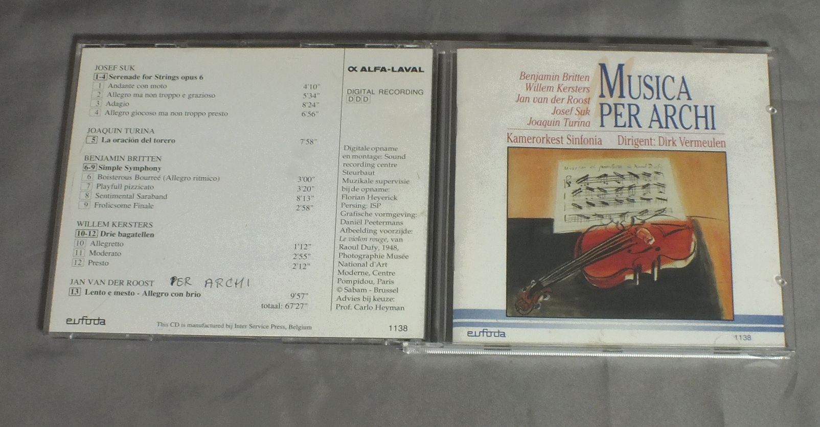 DIRK VERMEULEN/MUSICA PER ARCHI EUFODA1138 製造国:輸入盤 / Media:CD外観:EX盤の状態:EX+ 価格(税込):¥880 送料 7inch:定形外郵便 360円~LP:定形外郵便 660円~送料は、注文の最終画面で確認頂けます。 レコード検索 > QUEEN > DIRK VERMEULEN/MUSICA PER ARCHI 外観 (EX)特記事項:ブックレットは、表表紙の内側にサイン有り。ケース底のジャケに書き込み有ります。外観EXの共通説明:ダメージが限定的。中古品としては保存状態がよい方。シミ、ヨゴレ、スレ 少し~軽度。 盤の状態 (EX+)特記事項:微細なスリキズが少々。きれいな感じの盤面です。盤EX+の共通説明:盤面の極薄いスリキズ、スレ少し程度 音に出そうなものは無いように見える(極軽微なソフトティック音は除く)。 Tweet それぞれの画像をクリックすると、大きい写真が見られます こちらの商品もお勧めです 1,320円 ACHENBACH - DAS HEIDELBERGER KAMMERORCHESTERアッヘンバッハ - ハイデルベルグ室内管弦楽団 / BACH - MESSE IN H-MOLLバッハ - ロ短調ミサ曲 990円 BEAUX ARTS TRIOボザール・トリオ / BEETHOVEN - PIANO TRIO NO.7ベートーヴェン - ピアノ三重奏曲第7番