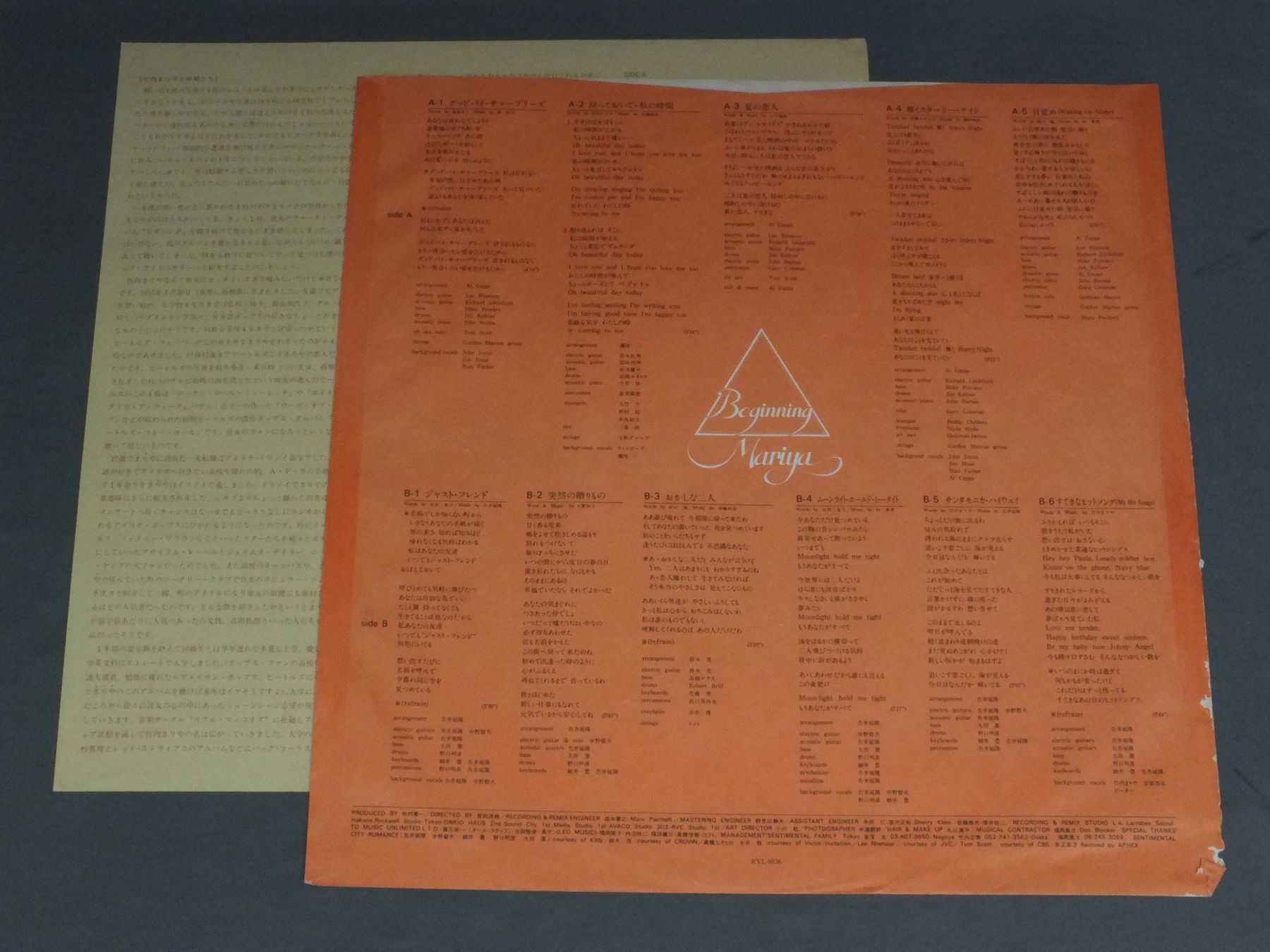 MARIYA TAKEUCHI竹内まりや/BEGINNING RVL8036 製造国:日本盤 / Media:LP外観:EX盤の状態:EX 価格(税込):¥2,616(売約済) 送料 7inch:定形外郵便 360円~LP:定形外郵便 660円~送料は、注文の最終画面で確認頂けます。 > > MARIYA TAKEUCHI/BEGINNING 外観 (EX)特記事項:角スレやヘリスレ有り。外観EXの共通説明:ダメージが限定的。中古品としては保存状態がよい方。シミ、ヨゴレ、スレ 少し~軽度。 盤の状態 (EX)特記事項:薄いスリキズ・スレ軽くある感じ。殆どが軽微なものの様子です。盤EXの共通説明:盤面のスリキズが薄いものが少し~軽度 音に出そうなものは無いように見える(軽微なソフトティック音は除く)。 Tweet それぞれの画像をクリックすると、大きい写真が見られます こちらの商品もお勧めです 770円 CHAGE & ASUKAチャゲ&飛鳥 / 4th ALBUN 21 CENTURY21世紀 550円 CHAGE & ASUKAチャゲ&飛鳥 / 4th ALBUM 21 CENTURY21世紀 770円 SHOGO HAMADA浜田省吾 / CLUB SNOWBOUND 770円 TULIPチューリップ / TULIP BEST心の旅 770円 GO OHGAMI大神剛 / SLEEPING THE TOWN 990円 MASAAKI SAKAI堺正章 / SOLITUDEひとりぼっちのマチャアキ 770円 RYOKO MORIYAMA森山良子 / RYOKO MORIYAMA COLLEGE FOLK ALBUM森山良子カレッジ・フォーク・アルバム 770円 VARIOUS JAPANESE POPSキング・レコード邦楽 / NOW HIT NOW ( NOW - サルビアの花)ナウ・ヒット・ナウ ( NOW - サルビアの花 収録)