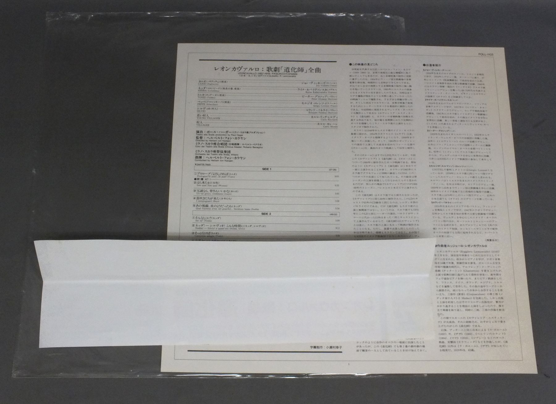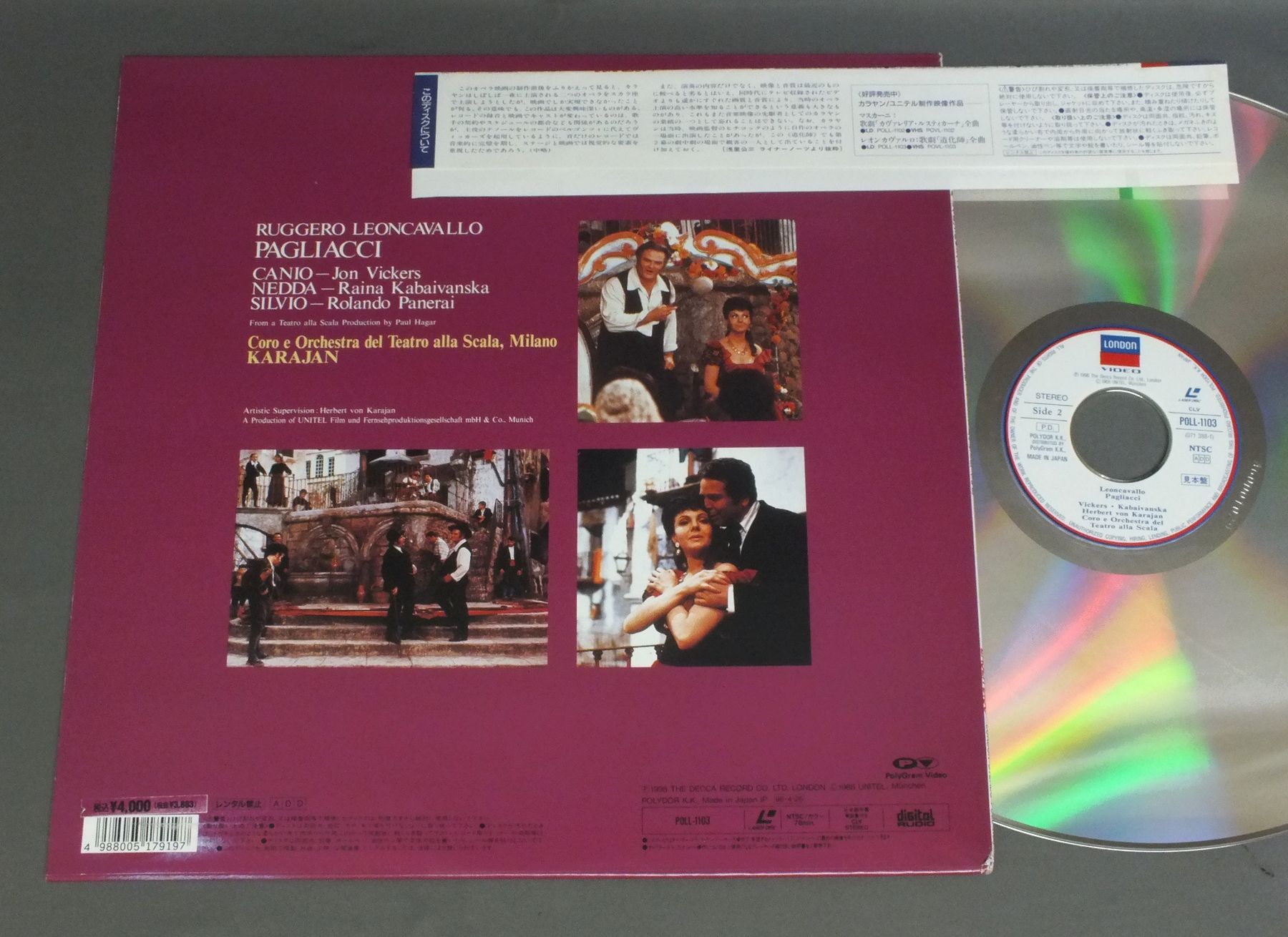 KARAJAN/SCARAカラヤン/ミラノ・スカラ座/LEONCAVALLO PAGLIACCIレオンカヴァルロ: 道化師 全曲 POLL-1103 製造国:日本盤 / Media:LD外観:EX盤の状態:EX帯:EX 価格(税込):¥990 送料 7inch:定形外郵便 360円~LP:定形外郵便 660円~送料は、注文の最終画面で確認頂けます。 レコード検索 > CLASSIC CHAMBER > KARAJAN/SCARA/LEONCAVALLO PAGLIACCI 外観 (EX)特記事項:特記なし。外観EXの共通説明:ダメージが限定的。中古品としては保存状態がよい方。シミ、ヨゴレ、スレ 少し~軽度。 盤の状態 (EX)特記事項:薄いスリキズ・スレ軽くある感じ。軽微なものの様子です。盤EXの共通説明:盤面のスリキズが薄いものが少し~軽度 音に出そうなものは無いように見える(軽微なソフトティック音は除く)。 帯の状態 (EX):特記なし。 その他:見本盤 Tweet それぞれの画像をクリックすると、大きい写真が見られます こちらの商品もお勧めです 2,860円 RICHTER - MUNICH BACH CHOIR & ORCHESTRAリヒテル - ミュンヘン・バッハ合唱団&管弦楽団 / BACH - MASS IN B MINORバッハ- ミサ曲ロ短調 1,320円 KUNZ - PAULIK - WIENNA STATE OPERA ORCHESTRA & CHORUSクンツ - パウリク - ウィーン国立歌劇場管弦楽団・合唱団 / ERICH KUNZ SINGS GERMAN UNIVERSITY SONGSドイツ学生の歌 1,320円 SCHWARZKOPF - LUDWIG - SYMPHONY ORCH. OF RADIO BERLINシュワルツコフ - ベルリン放送交響楽団 / WEBER - ABU HASSANウェーバー歌劇アブ・ハッサン 1,320円 BRUNO TURNER - ENSEMBLE PRO CANTIONE ANTIQUA LONDONブルーニ・ターナー - プロ・カンツォーネ・アンティカ / ORLANDO DI LASSO - REQUIEMオルランド・ディ・ラッソ - レクイエム 1,540円 VISHNEVSKAYA - ROSTROPOVICHガリーナ・ヴィシネフスカヤ - ロストロポーヴィチ / LIEDER SONGS CHANTS 2,420円 LILY PONSリリー・ポンス / LILY PONS GALA 1,540円 HELENE MANE (SOPRANO) & ZUZANA RUZICKOVA(HARPSICHORD)ヘレン・マネ(ソプラノ)&ズザナ・ルージチコヴァー(チェンバロ) / BACH - HANDEL etc 990円 ENRICO CARUSOエンリコ・カルーソ / ENRICO CARUSO VOL.2