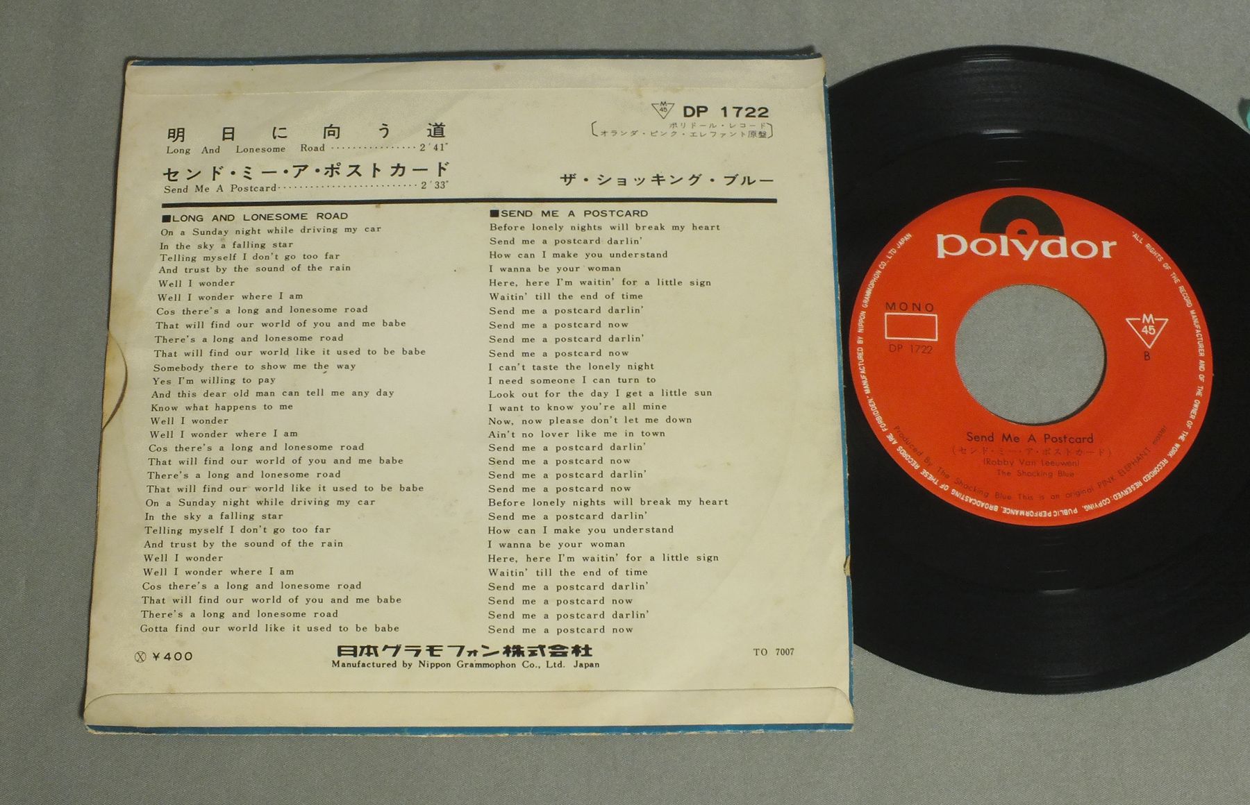 SHOCKING BLUEショッキング・ブルー/LONG AND LONESOME ROAD明日に向う道 DP1722 製造国:日本盤 / Media:7inch外観:VG盤の状態:VG+ 価格(税込):¥330 送料 7inch:定形外郵便 360円~LP:定形外郵便 660円~送料は、注文の最終画面で確認頂けます。 > > SHOCKING BLUE/LONG AND LONESOME ROAD 外観 (VG)特記事項:ヘリスレ大。底抜け背抜け有り。ヨレやシミ。外観VGの共通説明:ダメージが見るからに多い。 盤の状態 (VG+)特記事項:薄いスリキズ・細かいスレ多少。全体的には軽微なものが中心です。少し聴いてみましたが、音自体はしっかりクリアーに鳴っているようでした。盤VG+の共通説明:盤面にスリキズが多少~やや有り、音に出そうなものも多少ある。 Tweet それぞれの画像をクリックすると、大きい写真が見られます こちらの商品もお勧めです 2,640円 SPOTNICKSスプートニクス / KARELIA-THE BEST OF THE SPOTNICKS霧のカレリア-ベスト・オブ・ザ・スプートニクス 4,950円 ANIMALSアニマルズ / BEST ALBUM アニマルズのすべて 赤盤