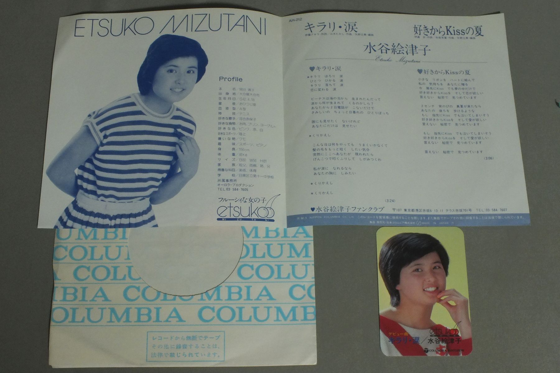 ETSUKO MIZUTANI水谷絵津子/KIRARI NAMIDAキラリ・涙 AH212 製造国:日本盤 / Media:7inch外観:EX+盤の状態:EX+ 価格(税込):¥1,980 送料 7inch:定形外郵便 360円~LP:定形外郵便 660円~送料は、注文の最終画面で確認頂けます。 > > ETSUKO MIZUTANI/KIRARI NAMIDA 外観 (EX+)特記事項:ヨレ少々。外観EX+の共通説明:中古としては美品、一見してきれいでダメージが軽微。シミ、ヨゴレ、スレ有っても僅か~少し。 盤の状態 (EX+)特記事項:極薄いスリキズ・スレ少し。一見してきれいな状態です。盤EX+の共通説明:盤面の極薄いスリキズ、スレ少し程度 音に出そうなものは無いように見える(極軽微なソフトティック音は除く)。 Tweet それぞれの画像をクリックすると、大きい写真が見られます こちらの商品もお勧めです 770円 NUMBER ONE BANDナンバーワン・バンド / MOMOもも 770円 FINGER FIVEフィンガー・ファイブ / GOLDEN HITS 770円 CHAGE & ASUKAチャゲ&飛鳥 / 4th ALBUN 21 CENTURY21世紀 990円 HATUMI SHIBATAしばたはつみ / BEST 16マイ・ラグジュアリー・ナイト しばたはつみ ベスト16 990円 MIZUKI OHURA大浦みずき / NIGHT & DAYナイト&デイ 770円 KAZUO ZAITSU財津和夫 / ROUND ABOUT WAY (SOLO CONCERT LIVE)ソロ・コンサート・ライヴ 880円 NUMBER ONE BANDナンバーワン・バンド / TOKYO ATARI東京あたり 770円 KOICHI MORITA & TOP GALLANTS森田公一 & トップギャラン / BEST HITSヒット全曲集
