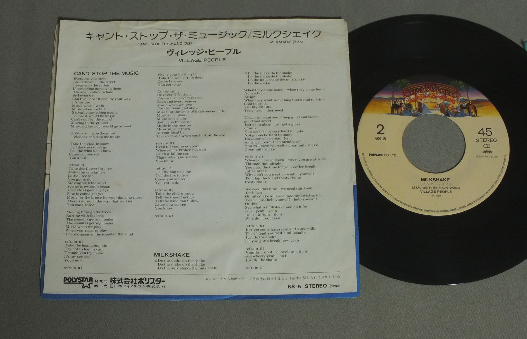 VILLAGE PEOPLEヴィレッジ・ピープル/CAN`T STOP THE MUSICキャント・ストップ・ザ・ミュージック 6S5 製造国:日本盤 / Media:7inch外観:VG+盤の状態:EX 価格(税込):¥440 送料 7inch:定形外郵便 360円~LP:定形外郵便 660円~送料は、注文の最終画面で確認頂けます。 > > VILLAGE PEOPLE/CAN`T STOP THE MUSIC 外観 (VG+)特記事項:ウォーターダメージ有り。上部に折れ跡。外観VG+の共通説明:ダメージやや有り。シミ、ヨゴレ、スレなど多少~やや多め。 盤の状態 (EX)特記事項:薄いスリキズ・スレ少しある感じ。一見してきれいな感じです。盤EXの共通説明:盤面のスリキズが薄いものが少し~軽度 音に出そうなものは無いように見える(軽微なソフトティック音は除く)。 Tweet それぞれの画像をクリックすると、大きい写真が見られます こちらの商品もお勧めです 990円 DONNY & MARIE / WINNING COMBINATION 1,320円 QUARTER FLASHクオーター・フラッシュ / QUARTER FLASHミッドナイト・フラッシュ 1,320円 CATE BROTHERS BANDケイト・ブラザーズ・バンド / RENDEZVOUSランデヴー 1,210円 EAGLESイーグルス / LONG RUNザ・ロング・ラン 1,650円 LIGHT HOUSEライトハウス / SUNNY DAYSサニー・デイズ 880円 SANTANAサンタナ / SANTANAサンタナのすべて 770円 MONKEESモンキーズ / PISCES AQUARIUS CAPRICORN &JONES LTD.スター・コレクター 1,320円 HASSLESハッスルズ / HASSLESハッスルズ
