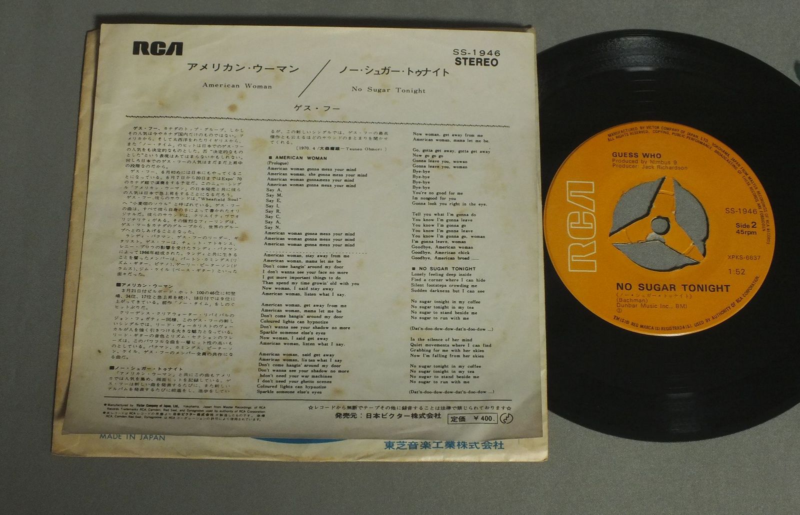 GUESS WHOゲス・フー/AMERICAN WOMANアメリカン・ウーマン SS1946 製造国:日本盤 / Media:7inch外観:EX-盤の状態:EX- 価格(税込):¥440 送料 7inch:定形外郵便 360円~LP:定形外郵便 660円~送料は、注文の最終画面で確認頂けます。 > > GUESS WHO/AMERICAN WOMAN 外観 (EX-)特記事項:ヨレ軽く有り。裏側にシミ。外観EX-の共通説明:ダメージ軽度~多少。 中古品としては普通の状態。シミ、ヨゴレ、スレなど軽く~多少。 盤の状態 (EX-)特記事項:薄いスリキズ・細かい表面スレ多少ある感じ。殆どが軽微なものの様子です。盤EX-の共通説明:盤面のスリキズが多少有り。音に出そうなものは殆ど無いように見える~さほど気にならないぐらいの軽いプチ数カ所程度。 Tweet それぞれの画像をクリックすると、大きい写真が見られます こちらの商品もお勧めです 660円 SNEAKERスニーカー / SNEAKER想い出のスニーカー 550円 GRAND FUNK RAILROADグランド・ファンク・レイルロード / CAUGHT IN THE ACTグランド・ファンク・ツアー75 1,210円 EAGLESイーグルス / LONG RUNザ・ロング・ラン 770円 STYXスティクス / CORNERSTONEコーナーストーン 770円 JEFFERSON AIRPLANEジェファーソン・エアプレーン / BLESS ITS POINTED LITTLE HEADフィルモアのジェファーソン・エアプレーン 1,210円 STYX酢亭久洲 / REPPOO烈風 1,320円 QUATRO SUZIスージー・クアトロ / QUATRO陶酔のアイドル 1,320円 KENNY ROGERS & THE FIRSY EDITIONケニー・ロジャーズとファースト・エディション / TELL IT ALL BROTHERテル・イット・オール・ブラザー