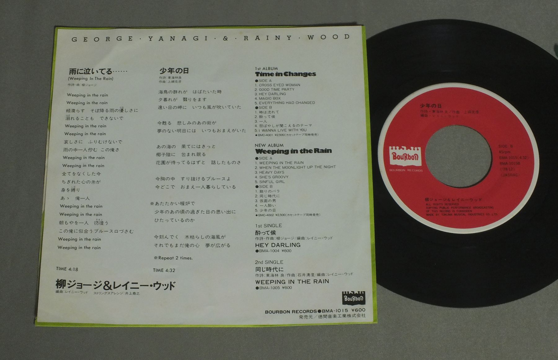 GEORGE YANAGI & RAINYWOOD柳ジョージ&レイニーウッド/WEEPING IN THE RAIN雨に泣いてる BMA1015 製造国:日本盤 / Media:7inch外観:EX盤の状態:EX- 価格(税込):¥330 送料 7inch:定形外郵便 360円~LP:定形外郵便 660円~送料は、注文の最終画面で確認頂けます。 > > GEORGE YANAGI & RAINYWOOD/WEEPING IN THE RAIN 外観 (EX)特記事項:ヨレ軽く有り。外観EXの共通説明:ダメージが限定的。中古品としては保存状態がよい方。シミ、ヨゴレ、スレ 少し~軽度。 盤の状態 (EX-)特記事項:薄いスリキズ・細かい表面スレ軽くある感じ。全体的には殆どが軽微なものの様子です。盤EX-の共通説明:盤面のスリキズが多少有り。音に出そうなものは殆ど無いように見える~さほど気にならないぐらいの軽いプチ数カ所程度。 Tweet それぞれの画像をクリックすると、大きい写真が見られます こちらの商品もお勧めです 770円 KAZE風 / WINDLESS BLUE 660円 KENICHI HAGIWARA萩原健一 / NADJAナジャ 770円 ALL NIGHTERSオールナイターズ / 2nd ALBUMKIRAっとジェネレーション 770円 MASAMICHI SUGI杉真理 / MISTONE 1,320円 CUTING EDGE / CUTING EDGE 990円 CAROLキャロル / 1975 4.13.1975 4.13. 770円 5 BALLOONS五つの赤い風船 / GAME OVERゲームは終わり 1,320円 TAMAKI SAWA沢たまき / DON`T SMOKE IN BEDベッドで煙草を吸わないで