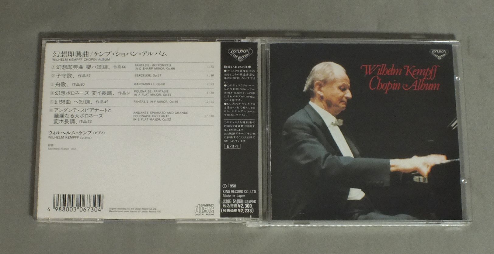 KEMPFFケンプ/CHOPIN ALBUM - FANTASIE - IMPROMPTU etcショパン・アルバム 幻想即興曲 230E51068 製造国:日本盤 / Media:CD外観:EX盤の状態:EX+ 価格(税込):¥1,100 送料 7inch:定形外郵便 360円~LP:定形外郵便 660円~送料は、注文の最終画面で確認頂けます。 > > KEMPFF/CHOPIN ALBUM - FANTASIE - IMPROMPTU etc 外観 (EX)特記事項:ヨレ、スレ、シミなど小 - 軽度です。外観EXの共通説明:ダメージが限定的。中古品としては保存状態がよい方。シミ、ヨゴレ、スレ 少し~軽度。 盤の状態 (EX+)特記事項:微細なスリキズが少々。きれいな感じの盤面です。盤EX+の共通説明:盤面の極薄いスリキズ、スレ少し程度 音に出そうなものは無いように見える(極軽微なソフトティック音は除く)。 Tweet それぞれの画像をクリックすると、大きい写真が見られます こちらの商品もお勧めです 1,540円 MAURIZIO POLLINIポリーニ / CHOPIN - POLONAISESショパン - ポロネーズ 990円 ASHKENAZYアシュケナージ / BEETHOVEN - PIANO SONATA NO.1ベートーヴェン - ピアノソナタ第1番 990円 SVIATOSLAV RICHTERスヴァトスラフ・リヒテル / RICHTER PIANO RECITALリヒテル - ピアノ・リサイタル 990円 GARRICK OHLSSONギャリック・オールソン / CHOPIN - POLONAISESショパン - ポロネーズ 990円 HOROVITZホロヴィッツ / BEETHOVEN - APPASSIONATA WALDSTEINベートーベン - ピアノ・ソナタ21番23番 990円 LANDOWSKA - KREISLER - RACHMANINOV etcランドフスカ - クライスラー - ラフマニノフ他 / FAMOUS INSTRUMENTALISTS OF THE EARLY 20th器楽奏者の巨匠たち 990円 WEISSENBERGワイセンベルク / BACH - PARTITAS VOL.2バッハ - パルティータ第2番5番6番 1,540円 WANDA LANDOWSKAワンダ・ランドフスカ / ARTISTRY OF WANDA LANDOWSKA
