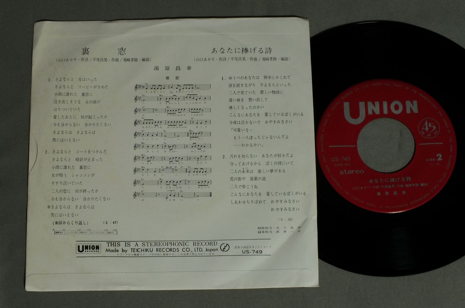 MASAYUKI YUHARA湯原昌幸/URAMADO裏窓 US749 製造国:日本盤 / Media:7inch外観:EX盤の状態:EX 価格(税込):¥880 送料 7inch:定形外郵便 360円~LP:定形外郵便 660円~送料は、注文の最終画面で確認頂けます。 > > MASAYUKI YUHARA/URAMADO 外観 (EX)特記事項:ヨレが少し。裏側に薄いシミ。外観EXの共通説明:ダメージが限定的。中古品としては保存状態がよい方。シミ、ヨゴレ、スレ 少し~軽度。 盤の状態 (EX)特記事項:薄いスリキズ・スレ少しある感じ。一見してきれいな感じです。盤EXの共通説明:盤面のスリキズが薄いものが少し~軽度 音に出そうなものは無いように見える(軽微なソフトティック音は除く)。 Tweet それぞれの画像をクリックすると、大きい写真が見られます こちらの商品もお勧めです 770円 IZUMI YUKIMURA雪村いづみ / I`M GETTING MY ACT TOGETHER & TAKING IT ON ROADミュージカル`旅立て女たち` 770円 NUMBER ONE BANDナンバーワン・バンド / MOMOもも 990円 TAOタオ / FAR EAST 1,870円 TAKURO YOSHIDAよしだたくろう / ON STAGEオン・ステージ ともだち 770円 KUMIKO YAMASHITA山下久美子 / BABY BABY 770円 YUMING松任谷由実 / RINCARNATIONリ・インカーネイション 770円 ALFEEアルフィー / PAGE ONE -13 PIECES OF ALFEE- 990円 SQUAREスクェア / ADVENTURESアドヴェンチャー