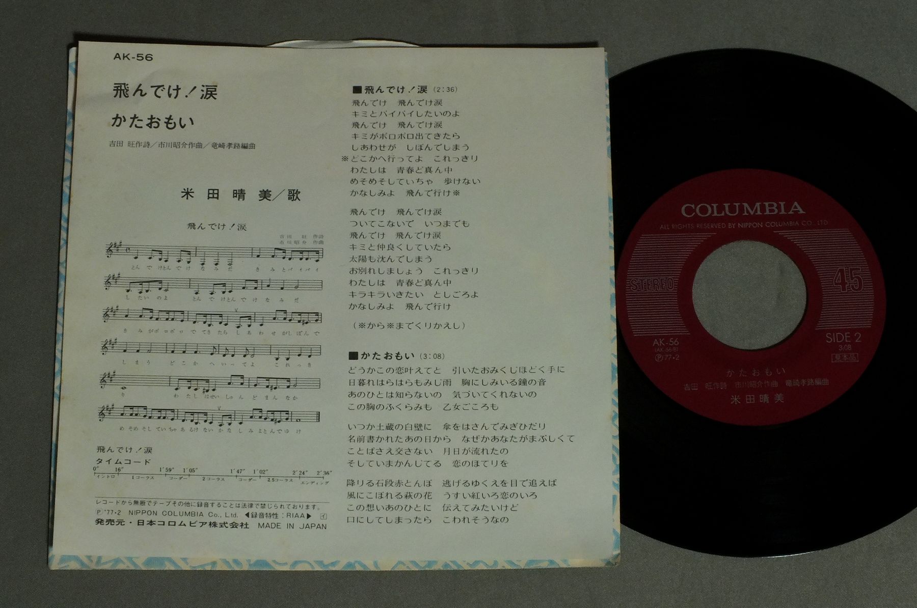 HARUMI YONEDA米田晴美/TONDEYUKE NAMIDA飛んでけ! 涙 AK56 製造国:日本盤 / Media:7inch外観:EX盤の状態:EX+ 価格(税込):¥770 送料 7inch:定形外郵便 360円~LP:定形外郵便 660円~送料は、注文の最終画面で確認頂けます。 > > HARUMI YONEDA/TONDEYUKE NAMIDA 外観 (EX)特記事項:シミやヨレが少し。外観EXの共通説明:ダメージが限定的。中古品としては保存状態がよい方。シミ、ヨゴレ、スレ 少し~軽度。 盤の状態 (EX+)特記事項:極薄いスリキズ・スレ少し。一見してきれいな状態です。盤EX+の共通説明:盤面の極薄いスリキズ、スレ少し程度 音に出そうなものは無いように見える(極軽微なソフトティック音は除く)。 その他:見本盤 Tweet それぞれの画像をクリックすると、大きい写真が見られます こちらの商品もお勧めです 1,980円 GOODBYE / FIFTH DIMENSION 770円 I SEONG-AE季成愛 / SAYONARAさよなら - 演歌の源流を探る 1,320円 TULIPチューリップ / LIVE THE 1000thライブ THE 1000th 660円 MAYUMI ITSUWA五輪真弓 / L`ETRANGERえとらんぜ 1,320円 NOA HORIGUCHI堀口ノア / NOA 990円 YUKO TOMITAとみたゆう子 / COLOURSカラーズ (1st ALBUM) 770円 NUMBER ONE BANDナンバーワン・バンド / MOMOもも 1,210円 RYOKO MORIYAMA森山良子 / IN NASHVILLEイン・ナッシュビル