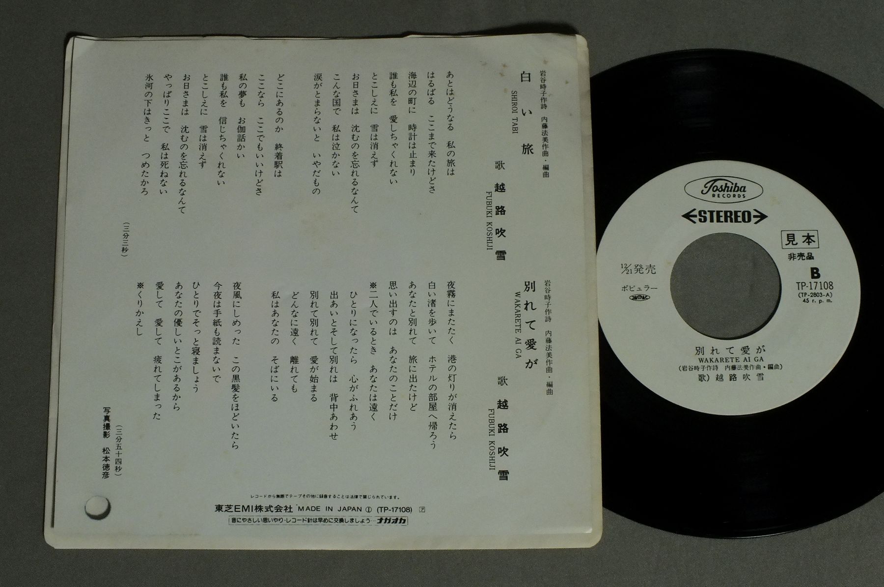 FUBUKI KOSHIJI越路吹雪/SHIROI TABI白い旅 TP17108 製造国:日本盤 / Media:7inch外観:EX盤の状態:EX+ 価格(税込):¥660 送料 7inch:定形外郵便 360円~LP:定形外郵便 660円~送料は、注文の最終画面で確認頂けます。 レコード検索 > J-POP > FUBUKI KOSHIJI/SHIROI TABI 外観 (EX)特記事項:右下にパンチ穴。ヨレやシミが少し。外観EXの共通説明:ダメージが限定的。中古品としては保存状態がよい方。シミ、ヨゴレ、スレ 少し~軽度。 盤の状態 (EX+)特記事項:極薄いスリキズ・スレ少し。一見してきれいな状態です。盤EX+の共通説明:盤面の極薄いスリキズ、スレ少し程度 音に出そうなものは無いように見える(極軽微なソフトティック音は除く)。 その他:白見本 Tweet それぞれの画像をクリックすると、大きい写真が見られます こちらの商品もお勧めです 770円 KAZE風 / WINDLESS BLUE 990円 MASAMICHI SUGI杉真理 / STARGAZERスターゲイザー 880円 NUMBER ONE BANDナンバーワン・バンド / TOKYO ATARI東京あたり 660円 BAKUFU SLUMPA爆風スランプ / YOIよい 1,650円 TAKUROU YOSHIDA吉田拓郎 / IN BUDOKAN王様達のハイキング IN BUDOKAN 990円 MAYUMI ITUWA五輪真弓 / SHUNNSHUU春愁 440円 YASUHIRO SUZUKI鈴木康博 / SINCERELY 770円 HIROMI IWASAKI岩崎宏美 / HIKOUSEN飛行船