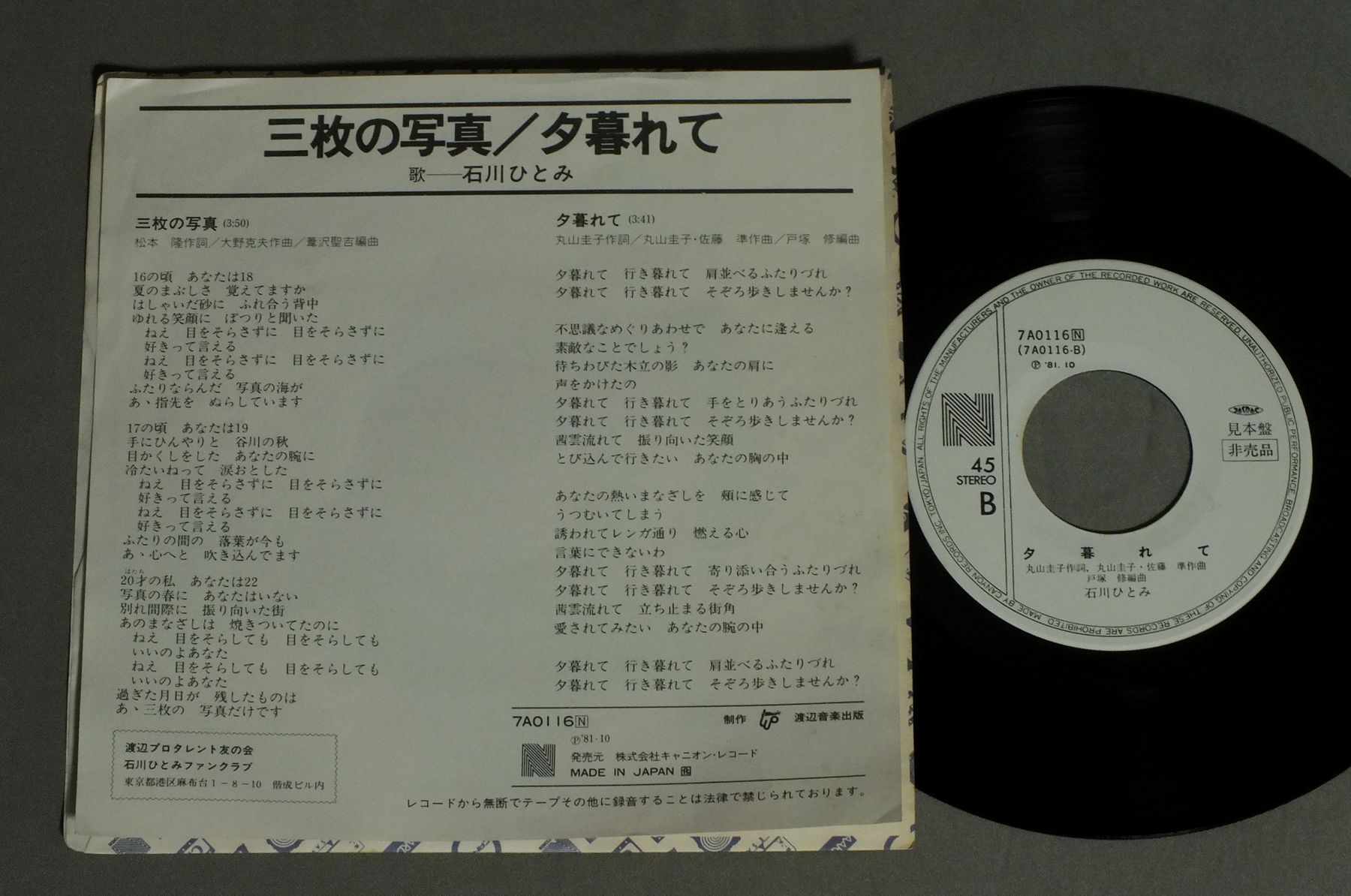 HITOMI石川ひとみ/3 PHOTOS三枚の写真 7A0116 製造国:日本盤 / Media:7inch外観:EX盤の状態:EX 価格(税込):¥770 送料 7inch:定形外郵便 360円~LP:定形外郵便 660円~送料は、注文の最終画面で確認頂けます。 > > HITOMI/3 PHOTOS 外観 (EX)特記事項:シミやや有り。外観EXの共通説明:ダメージが限定的。中古品としては保存状態がよい方。シミ、ヨゴレ、スレ 少し~軽度。 盤の状態 (EX)特記事項:薄いスリキズ・スレ少しある感じ。一見してきれいな感じです。盤EXの共通説明:盤面のスリキズが薄いものが少し~軽度 音に出そうなものは無いように見える(軽微なソフトティック音は除く)。 その他:白見本 Tweet それぞれの画像をクリックすると、大きい写真が見られます こちらの商品もお勧めです 660円 YOU HAYAMI早見優 / IMAGEイマージュ 990円 SONOKO KAWAI河合その子 / SIESTAシエスタ 660円 TOSHIRO OHMI近江俊郎 / BEST COLLECTION懐かしの歌声デラックス 湯の町エレジー 770円 NAOKO KAWAI河合奈保子 / NAOKO IN CONCERT河合奈保子 カナリー・コンサート PART 2 1,210円 ONYANNKO CLUBおニャン子クラブ / DREAM CATALOGUE夢カタログ 1,210円 PINK LADYピンク・レディー / PINK LADY CHALLENGE CONCERTピンク・レディー・チャレンジ・コンサート 1,210円 SAORI MINAMI南沙織 / SUFFERING AGEヤングのテーマ 傷つく世代 1,210円 HIROMI IWASAKI岩崎宏美 / ROMANTIC CONCERT 2ロマンティック・コンサート2 + ピンナップ付