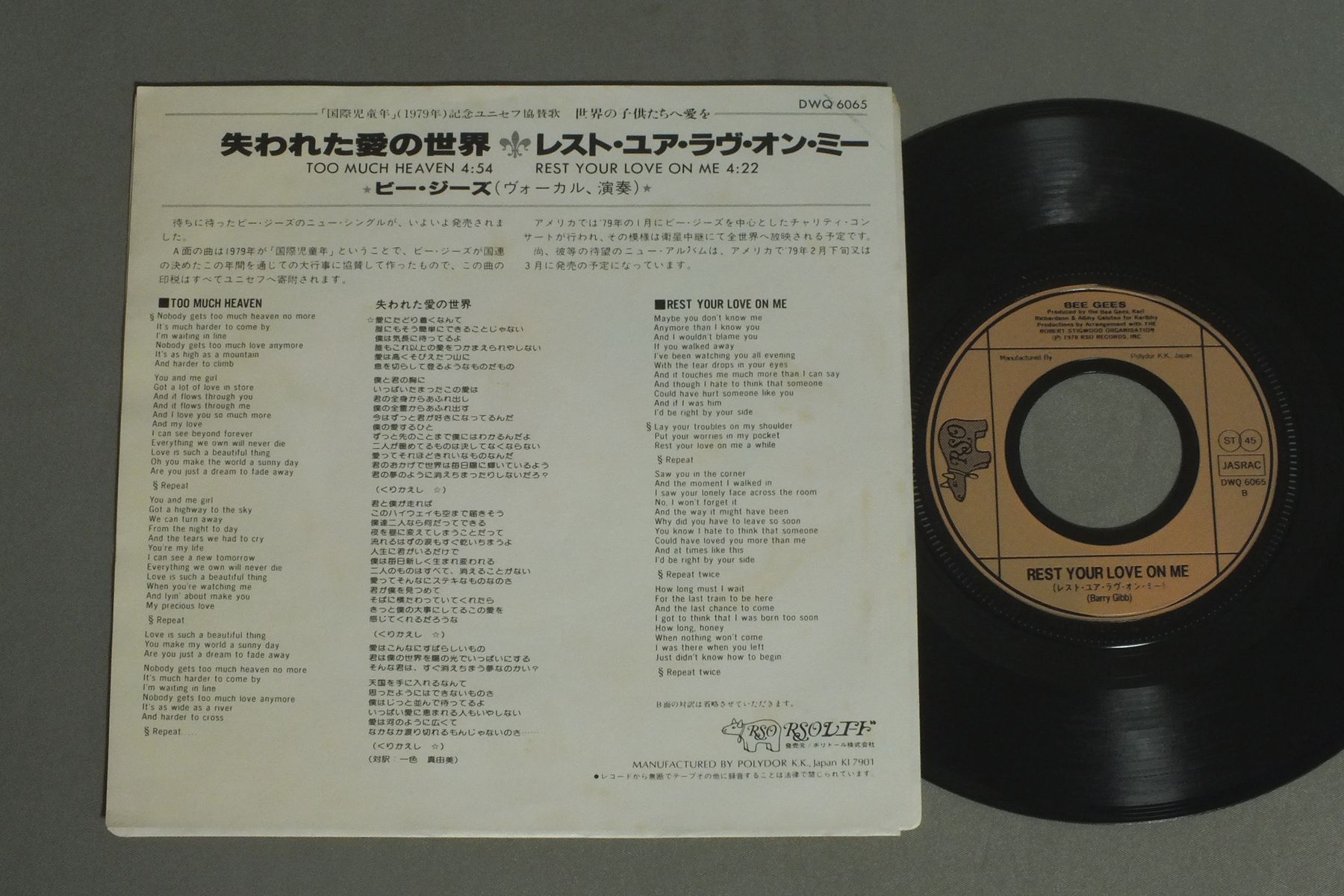 BEE GEESビー・ジーズ/TOO MUCH HEAVEN失われた愛の世界 DWQ6065 製造国:日本盤 / Media:7inch外観:EX盤の状態:EX+ 価格(税込):¥550 送料 7inch:定形外郵便 360円~LP:定形外郵便 660円~送料は、注文の最終画面で確認頂けます。 > > BEE GEES/TOO MUCH HEAVEN 外観 (EX)特記事項:裏側にシミやや有り。外観EXの共通説明:ダメージが限定的。中古品としては保存状態がよい方。シミ、ヨゴレ、スレ 少し~軽度。 盤の状態 (EX+)特記事項:薄いスリキズ・スレ少し。一見してきれいな状態です。盤EX+の共通説明:盤面の極薄いスリキズ、スレ少し程度 音に出そうなものは無いように見える(極軽微なソフトティック音は除く)。 Tweet それぞれの画像をクリックすると、大きい写真が見られます こちらの商品もお勧めです 770円 MARC BOLANマーク・ボラン / YOU SCARE ME TO DEATH霊魂の叫び 770円 ABBAアバ / ARRIVALアライバル 1,210円 BEE GEESビー・ジーズ / SOUNDTRACK STAYING ALIVE映画 ステイン・アライヴ 990円 BAD COMPANYバッド・カンパニー / RUN WITH THE PACKバッド・カンパニー ?-ラン・ウィズ・ザ・パック 2,750円 SHOCKING BLUEショッキング・ブルー / LIVE IN JAPANLIVE IN JAPAN 1,320円 WILLIE & THE POOR BOYSウィリーとプア・ボーイズ / ACTION FOR RESEARCH INTO MULTIPLE SCLEROSISロニー・レイン救済基金 770円 ABBAアバ / VOULEZ-VOUSヴーレ・ヴー 770円 ABBAアバ / GREATEST HITS VOL.2グレイテスト・ヒッツVOL.2