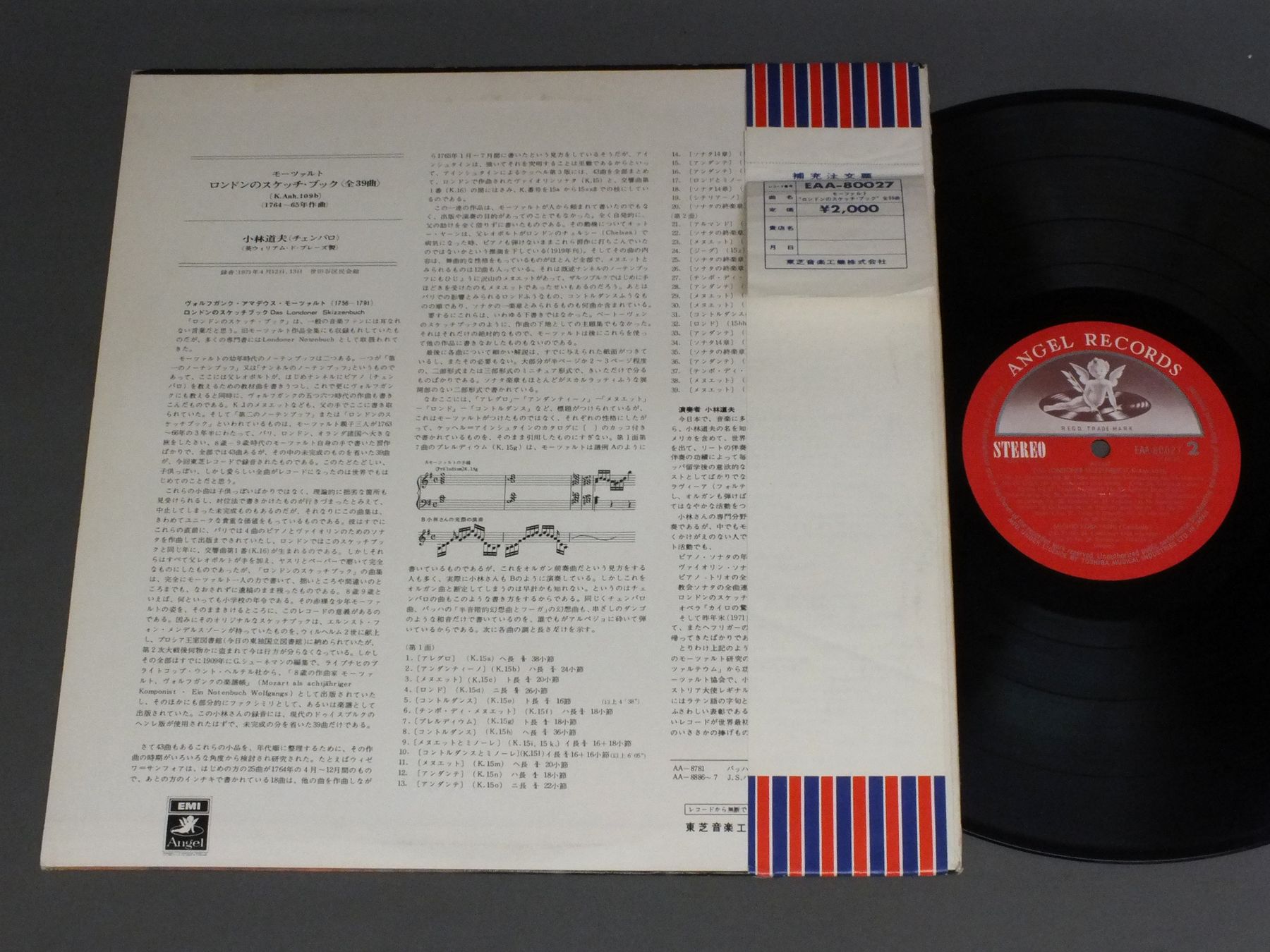 MICHIO KOBAYASHI小林道夫/MOZART/DAS LONDONER SKIZZENBUCHモーツァルト/ロンドンのスケッチ・ブック(全39曲) EAA80027 製造国:日本盤 / Media:LP外観:EX盤の状態:EX帯:EX 価格(税込):¥1,210(売約済) 送料 7inch:定形外郵便 360円~LP:定形外郵便 660円~送料は、注文の最終画面で確認頂けます。 > > MICHIO KOBAYASHI/MOZART/DAS LONDONER SKIZZENBUCH 外観 (EX)特記事項:ヘリスレ有り。外観EXの共通説明:ダメージが限定的。中古品としては保存状態がよい方。シミ、ヨゴレ、スレ 少し~軽度。 盤の状態 (EX)特記事項:薄いスリキズ・スレ軽くある感じ。軽微なものの様子です。盤EXの共通説明:盤面のスリキズが薄いものが少し~軽度 音に出そうなものは無いように見える(軽微なソフトティック音は除く)。 帯の状態 (EX):特記なし。 Tweet それぞれの画像をクリックすると、大きい写真が見られます こちらの商品もお勧めです 990円 ANCERLアンチェル / MUSSORGSKY-PICTURES AT AN EXHIBITIONムソルグスキー-展覧会の絵-はげ山の一夜 1,980円 LUKACS - JAPAN PHILHARMONIC SYMPHONY ORCHESTRAルカーチ - 日本フィルハーモニー交響楽団 / BRAHMS - SYMPHONY NO.4ブラームス - 交響曲第4番 990円 KLEMPERER - PHILHARMONIA ORCH.クレンペラー - フィルハーモニア管弦楽団 / WAGNER ORCH. WORKSワーグナー管弦楽集 990円 FRANZJOSEF MAIERフランツヨーゼフ・マイアー / MOZART-SYM. KV 550-KV319モーツァルト-交響曲第40・33番 990円 BERMAN - KARAJAN - BERLIN PHILHARMONIC ORCHESTRAベルマン - カラヤン - ベルリンフィルハーモニー管弦楽団 / TSCHAIKOVSKY - CONCERTO FOR PIANO UND ORCHESTRA NO.1チャイコフスキー - ピアノ協奏曲第1番 1,430円 FURTWANGLERフルトヴェングラー / BEETHOVEN SYMPHONYS交響曲へのお誘い`第1集` 1,320円 NIKISCH - BERLIN PPHIL. ORCH.アルトゥール・ニキッシュ / BERLIOZ - ROMAN CARNIVALベルリン・フィル歴史的名演集 990円 KARAJANカラヤン / BEETHOVEN-SYM.SNO3 & NO6ベートーヴェン交響曲第三番-第六番