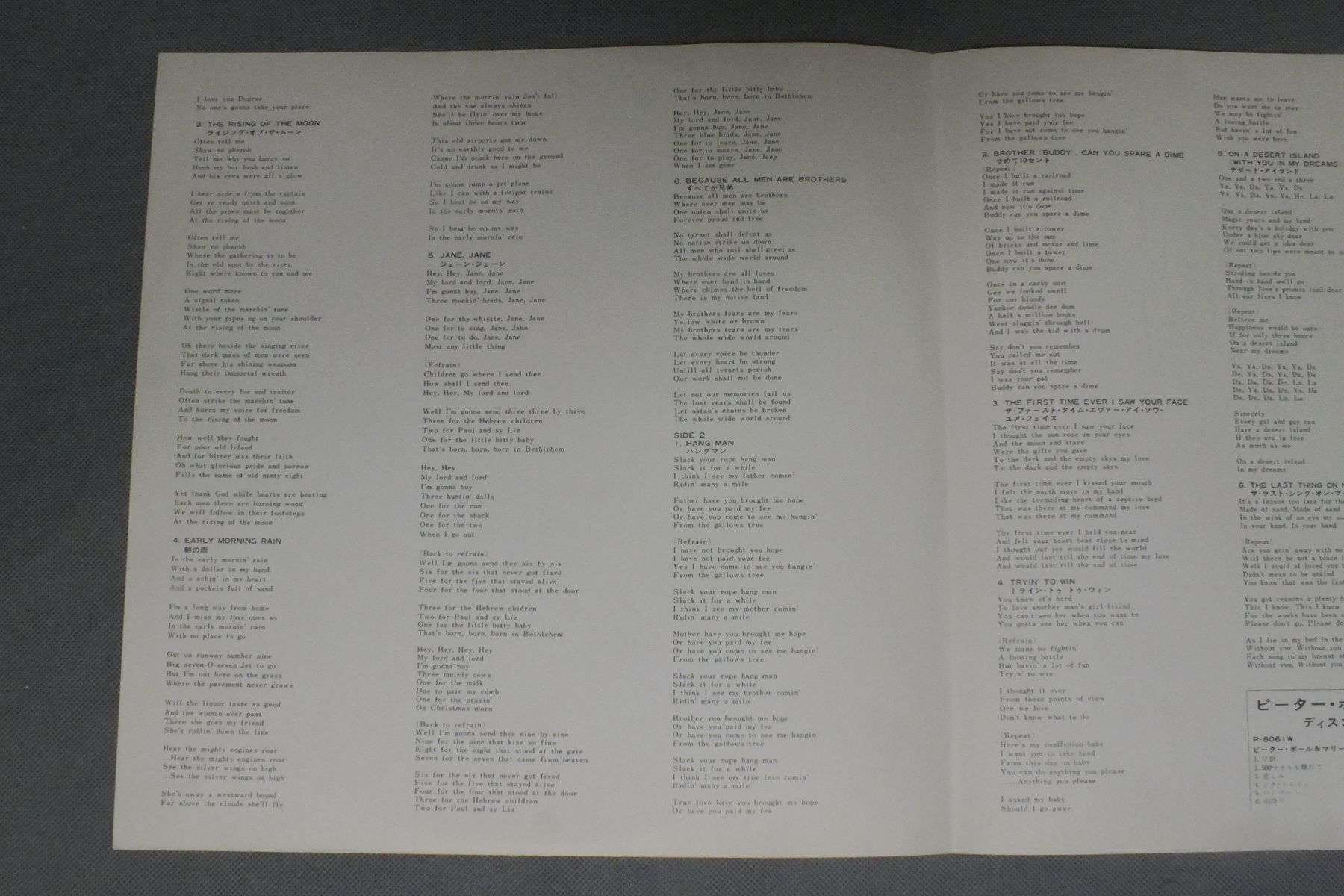 PETER PAUL&MARYピーター・ポール&マリー/SEE WHAT TOMORROW BRINGS歌声は永遠に P-8065W 製造国:日本盤 / Media:LP外観:EX盤の状態:EX 価格(税込):¥1,100(売約済) 送料 7inch:定形外郵便 360円~LP:定形外郵便 660円~送料は、注文の最終画面で確認頂けます。 > > PETER PAUL&MARY/SEE WHAT TOMORROW BRINGS 外観 (EX)特記事項:特記なし。外観EXの共通説明:ダメージが限定的。中古品としては保存状態がよい方。シミ、ヨゴレ、スレ 少し~軽度。 盤の状態 (EX)特記事項:薄いスリキズ・スレ軽くある感じ。軽微なものの様子です。盤EXの共通説明:盤面のスリキズが薄いものが少し~軽度 音に出そうなものは無いように見える(軽微なソフトティック音は除く)。 その他:見本盤 Tweet それぞれの画像をクリックすると、大きい写真が見られます こちらの商品もお勧めです 770円 BROTHERS FOURブラザース・フォア / HONEY WIND BLOWSビッグ・フォーク・ヒッツ 第3集 770円 NITTY GRITTY DIRT BANDニッティー・グリッティー・ダート・バンド / UNCLE CHARLIE & HIS DOG TEDDYアンクル・チャーリーと愛犬テディー 990円 KITTY WELLSキティ・ウェルズ / DUST ON THE BIBLEダスト・オン・ザ・バイブル 990円 BANJO BARONSバンジョー・バロンズ / IT`S A FOLK FOLK FOLK FOLK WORLDバンジョー. フォーク・ソングの世界 ペラジャケ 990円 PETER PAUL & MARYピーター・ポール&マリー / IN CONCERT 770円 NITTY GRITTY DIRT BANDニッティー・グリッティー・ダート・バンド / STARS&STRIPES FOREVER星条旗よ永遠なれ! 770円 PETER PAUL&MARYピーター・ポール&マリー / LATE AGAINレイト・アゲイン 660円 JOAN BAEZジョーン・バエズ / JOAN自由の女神