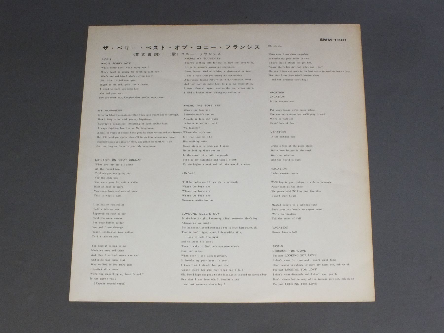 CONNIE FRANCISコニー・フランシス/VERY BEST OF CONNIE FRANCISベリー・ベスト・オブ・コニー・フランシス SMM1001 製造国:日本盤 / Media:LP外観:EX-盤の状態:EX- 価格(税込):¥1,320(売約済) 送料 7inch:定形外郵便 360円~LP:定形外郵便 660円~送料は、注文の最終画面で確認頂けます。 レコード検索 > SWING/BIG BAND > CONNIE FRANCIS/VERY BEST OF CONNIE FRANCIS 外観 (EX-)特記事項:底抜け有り外観EX-の共通説明:ダメージ軽度~多少。 中古品としては普通の状態。シミ、ヨゴレ、スレなど軽く~多少。 盤の状態 (EX-)特記事項:薄いスリキズ・細かい表面スレ軽くある感じです。プチ出そうな所は少し。軽微なものが中心の様子です。盤EX-の共通説明:盤面のスリキズが多少有り。音に出そうなものは殆ど無いように見える~さほど気にならないぐらいの軽いプチ数カ所程度。 Tweet それぞれの画像をクリックすると、大きい写真が見られます こちらの商品もお勧めです 770円 OLIVIA NEWTON-JOHNオリビア・ニュートン・ジョン / PHYSICAL虹色の扉 770円 LACY J DALTONレイシー・ダルトン / TENNESSEE WALTZテネシー・ワルツ 770円 KIM WILDEキム・ワイルド / KIM WILDE誘惑のキム 770円 RITA COOLIDGEリタ・クーリッジ / SOUNDS CAPSULE 770円 LYNN ANDERSONリン・アンダーソン / STAY THERE `TIL I GET THERE私の願い 770円 PAT BENATARパット・べネター / PRECIOUS TIMEプレシャス・タイム 770円 VIKKI CARRヴィッキー・カー / LIVE AT THE GREEK THEATREグリーク・シアターのヴィッキー・カー 880円 ORIVIA NEWTON-JOHNオリビア・ニュートン・ジョン / DON`T STOP BELIEVIN`たそがれの恋