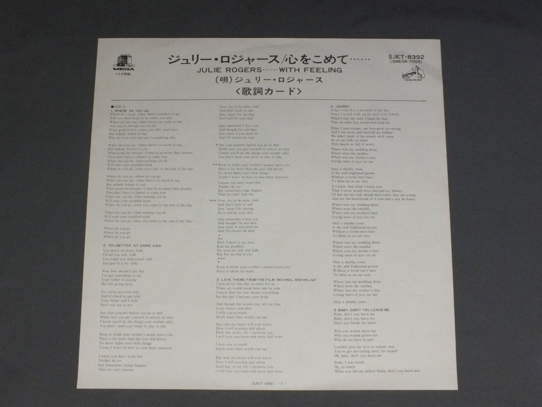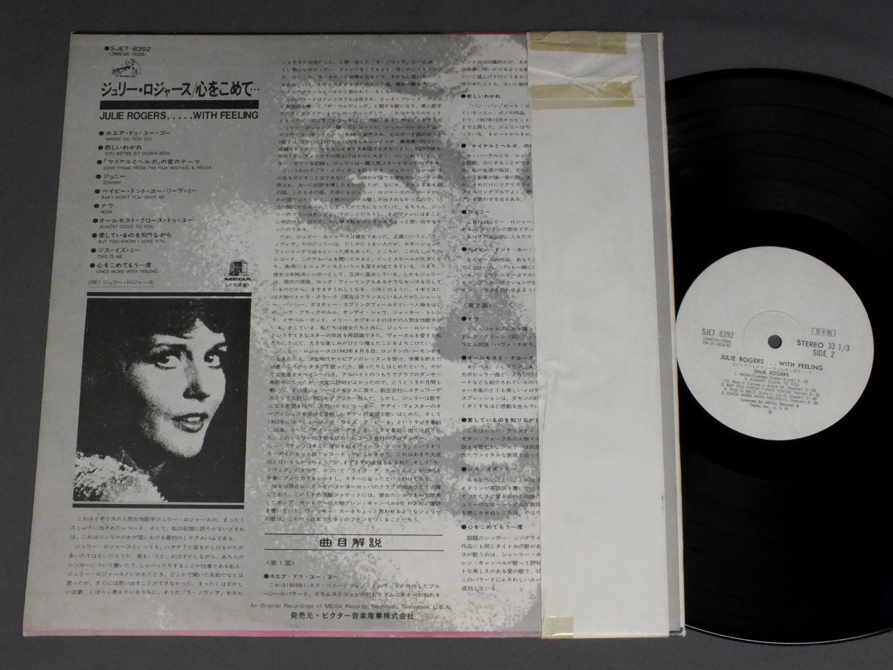 JULIE ROGERSジュリー・ロジャース/WITH FEELING !心をこめて SJET8392 製造国:日本盤 / Media:LP外観:EX盤の状態:EX-帯:VG+ 価格(税込):¥550(売約済) 送料 7inch:定形外郵便 360円~LP:定形外郵便 660円~送料は、注文の最終画面で確認頂けます。 > > JULIE ROGERS/WITH FEELING ! 外観 (EX)特記事項:特記なし。外観EXの共通説明:ダメージが限定的。中古品としては保存状態がよい方。シミ、ヨゴレ、スレ 少し~軽度。 盤の状態 (EX-)特記事項:薄いスリキズ・細かい表面スレ多少ある感じ。殆どが軽微なものの様子です。盤EX-の共通説明:盤面のスリキズが多少有り。音に出そうなものは殆ど無いように見える~さほど気にならないぐらいの軽いプチ数カ所程度。 帯の状態 (VG+):テープ補修有り。 その他:白見本盤 Tweet それぞれの画像をクリックすると、大きい写真が見られます こちらの商品もお勧めです 1,210円 AMALIA RODRIGUESアマリア・ロドリゲス / GOSTAVA DE SER QUEM ERA私の中のファド 990円 DORIS DAY - ROBERT GOULETドリス・デイ - ロバート・グーレ / ANNIE GET YOUR GUN 60s ISSUEアニーよ銃をとれ ペラジャケ 660円 MELISSA MANCHESTERメリサ・マンチェスター / EMERGENCYエマージェンシー 770円 PAT BENATARパット・べネター / LIVE FROM EARTHライブ・フロム・アース 770円 MARILYN MARTINマリリン・マーティン / MARILYN MARTINマリリン・マーティン 440円 MARILYN MARTINマリリン・マーティン / MARILYN MARTINマリリン・マーティン 990円 VERONIQUE SANSONヴェロニック・サンソン / LIVE AT THE OLYMPIAライヴ・アット・オランピア 880円 DAMIAダミア / CHANSON BEST COLLECTION 1500 DAMIAシャンソン・ベスト・コレクション1500 ダミア-暗い日曜日