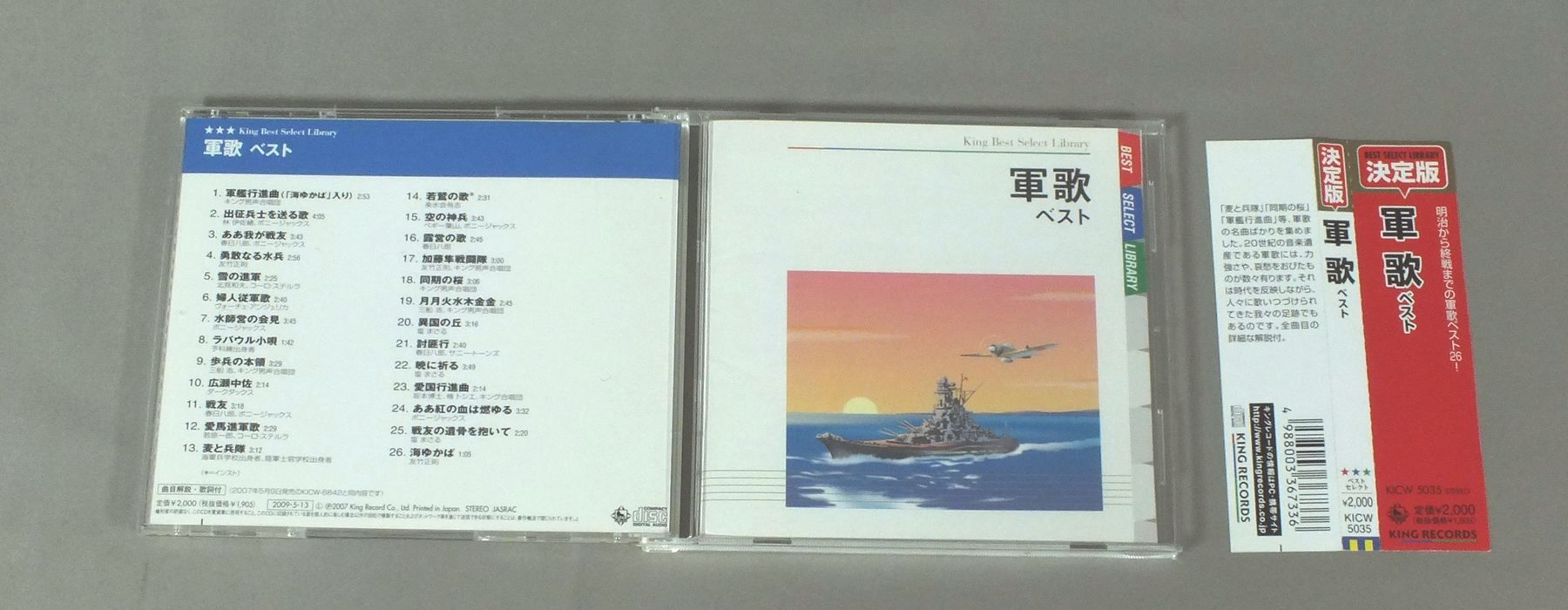 キング男性合唱団/林伊佐緒/ボニージャックス 他/決定版 軍歌ベスト KICW5035 製造国:日本盤 / Media:CD外観:EX+盤の状態:EX+帯:EX+ 価格(税込):¥2,200 送料 7inch:定形外郵便 360円~LP:定形外郵便 660円~送料は、注文の最終画面で確認頂けます。 > > / 外観 (EX+)特記事項:ヨレ、スレ少々。ヨゴレなども少しだけできれいな感じです。外観EX+の共通説明:中古としては美品、一見してきれいでダメージが軽微。シミ、ヨゴレ、スレ有っても僅か~少し。 盤の状態 (EX+)特記事項:微細なスリキズが少々。きれいな感じの盤面です。盤EX+の共通説明:盤面の極薄いスリキズ、スレ少し程度 音に出そうなものは無いように見える(極軽微なソフトティック音は除く)。 帯の状態 (EX+):あまりヨレやよごれ等は無くきれいな感じ。 Tweet それぞれの画像をクリックすると、大きい写真が見られます こちらの商品もお勧めです