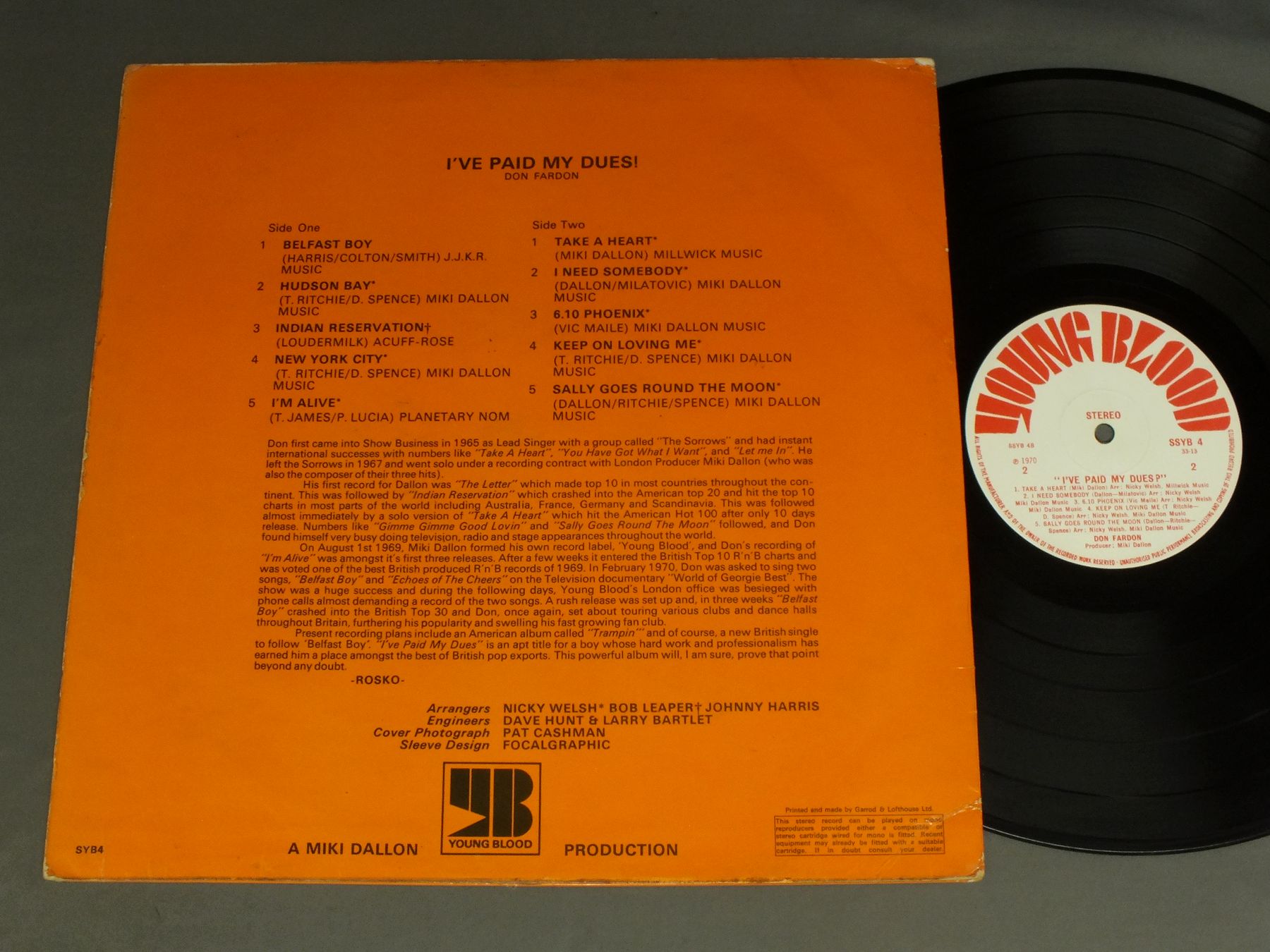 DON FARDON/I`VE PAID MY DUUES SSYB4 製造国:英国盤 / Media:LP外観:EX-盤の状態:EX 価格(税込):¥2,310(売約済) 送料 7inch:定形外郵便 360円~LP:定形外郵便 660円~送料は、注文の最終画面で確認頂けます。 > > DON FARDON/I`VE PAID MY DUUES 外観 (EX-)特記事項:両面コーティングジャケ。背表紙上付近にコーティングの折れシワ有り。それを除けばコーティングのヨレシワは全体的に少なめ。レコードリングスレ等スレやよごれ多少有り。レコード取り出し口淵でヨレ多少有り。外観EX-の共通説明:ダメージ軽度~多少。 中古品としては普通の状態。シミ、ヨゴレ、スレなど軽く~多少。 盤の状態 (EX)特記事項:あまりスリキズ無くきれいな状態。盤EXの共通説明:盤面のスリキズが薄いものが少し~軽度 音に出そうなものは無いように見える(軽微なソフトティック音は除く)。 その他:伝説のビートバンドSORROWSのリードボーカルのソロアルバム。まだまだ黒っぽい雰囲気を漂わせたSSWといった感じ。なんとSORROWSのTAKE A HEARTも収録。 Tweet それぞれの画像をクリックすると、大きい写真が見られます こちらの商品もお勧めです 1,320円 WILD WILLY BARRET / CALL OF THE WORLD 550円 RONNIE MILSAP / ONLY ONE LOVE IN MY LIFE 550円 RONNIE MILSAP / KEVED UP 660円 IAN MATTHEWS / STEALIN` HOME 990円 PAUL YOUG / BETWEEN TWO FIRES 990円 RICKY SHAYNE / MAMY BLUE 770円 GARY BENSON / MOONLIGHT WALKING 1,650円 KEITH / ADVENTURES OF KEITH