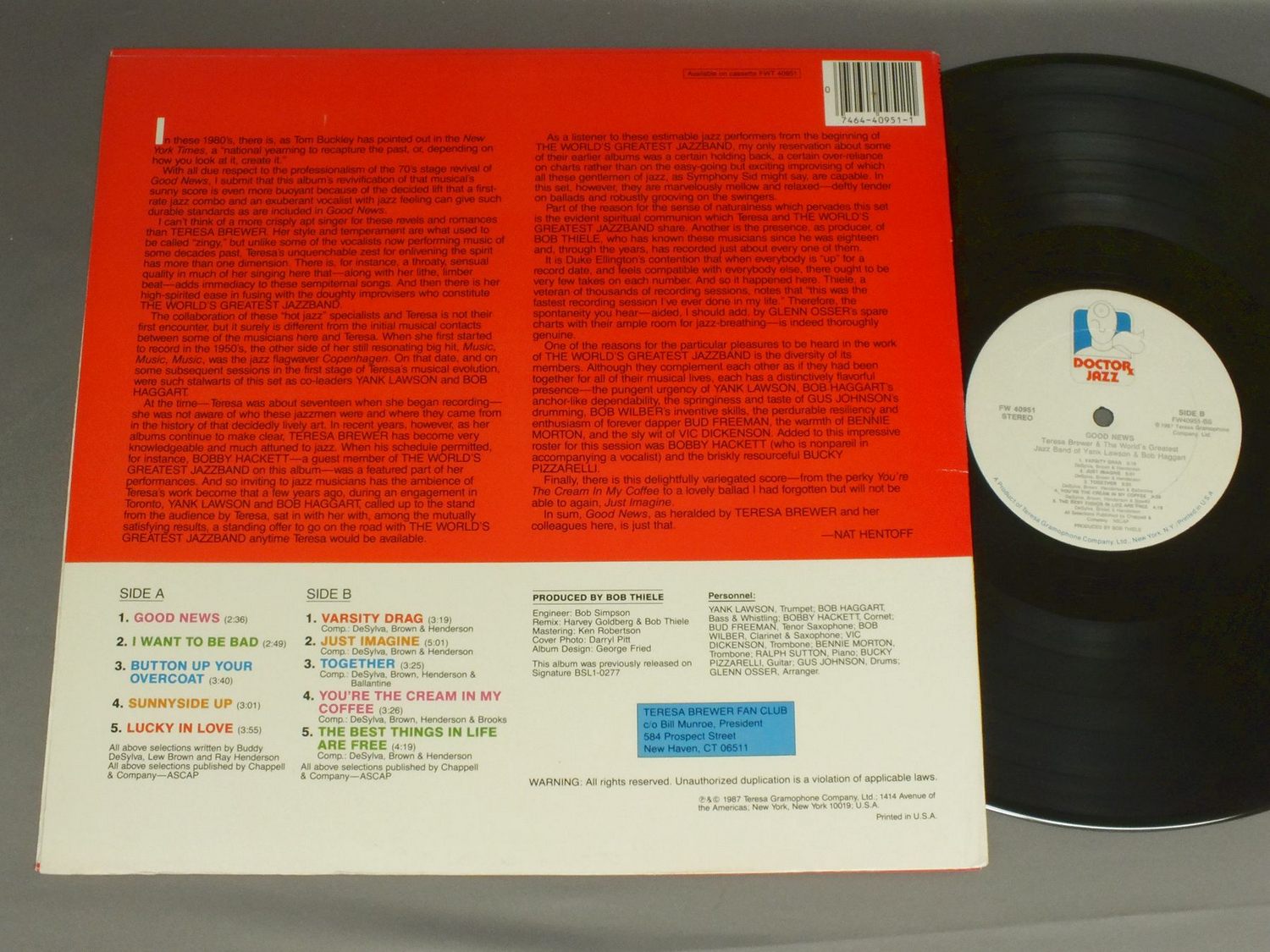 TERSA BREWER/GOOD NEWSRALPH SUTTONサイン付 FW40951 製造国:米国盤 / Media:LP外観:EX+盤の状態:EX+ 価格(税込):¥1,760(売約済) 送料 7inch:定形外郵便 360円~LP:定形外郵便 660円~送料は、注文の最終画面で確認頂けます。 > > TERSA BREWER/GOOD NEWS 外観 (EX+)特記事項:特記なし。外観EX+の共通説明:中古としては美品、一見してきれいでダメージが軽微。シミ、ヨゴレ、スレ有っても僅か~少し。 盤の状態 (EX+)特記事項:薄いスリキズ・スレ少し。一見してきれいな状態です。盤EX+の共通説明:盤面の極薄いスリキズ、スレ少し程度 音に出そうなものは無いように見える(極軽微なソフトティック音は除く)。 Tweet それぞれの画像をクリックすると、大きい写真が見られます こちらの商品もお勧めです 5,500円 RUBY BRAFF / HUSTLIN` & BUSTLIN` 770円 LIONEL HAMPTON / BRAT OF THE BIG BANDS GOOD VIBES 660円 DUKE ELLINGTON etc / GRANDI ORCHESTRE 1,100円 CLAUDE HOPKINS & HIS ORCHESTRA / 1932-1933 1940 1,100円 HARRY JAMESハリー・ジェイムズ / ALL ABOUT HARRY JAMES 1,100円 BENNY GOODMAN / ESSENTIAL 550円 DICK HAYMES VIC DAMONE etc / POP SINGERS ON THE AIR! 1,210円 HARRY JAMES etc / BIG BANDS GREATEST HITS VOLUME 2