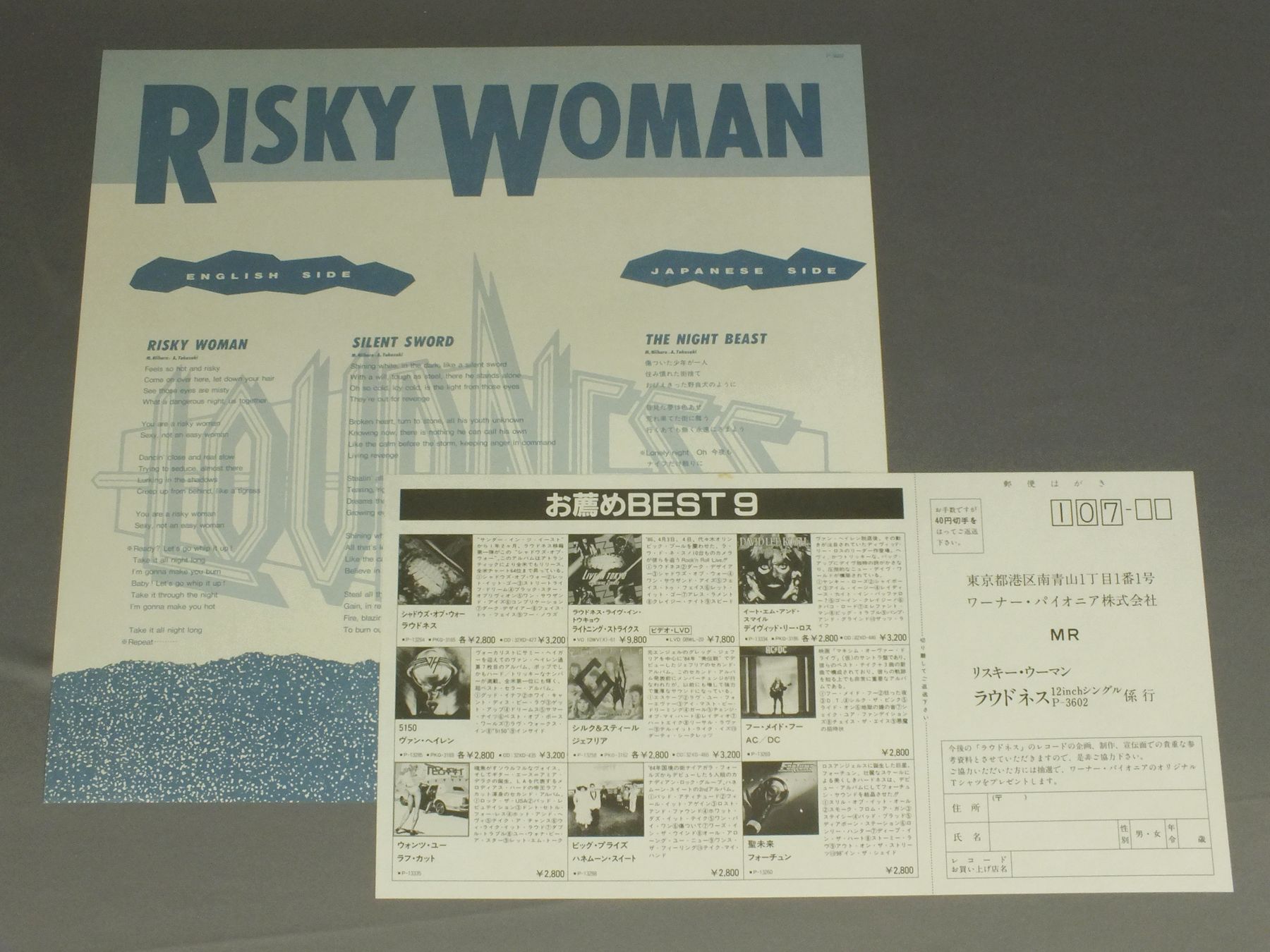 LOUDNESS/RISKY WOMAN P3602 製造国:日本盤 / Media:12inch外観:EX+盤の状態:EX+帯:EX+ 価格(税込):¥1,320 送料 7inch:定形外郵便 360円~LP:定形外郵便 660円~送料は、注文の最終画面で確認頂けます。 > > LOUDNESS/RISKY WOMAN 外観 (EX+)特記事項:特記なし。外観EX+の共通説明:中古としては美品、一見してきれいでダメージが軽微。シミ、ヨゴレ、スレ有っても僅か~少し。 盤の状態 (EX+)特記事項:極薄いスリキズ・スレ少し。一見してきれいな状態です。盤EX+の共通説明:盤面の極薄いスリキズ、スレ少し程度 音に出そうなものは無いように見える(極軽微なソフトティック音は除く)。 帯の状態 (EX+):特記なし。 Tweet それぞれの画像をクリックすると、大きい写真が見られます こちらの商品もお勧めです 1,650円 NICOTINEニコチン / CARNIVAL未開封 990円 44 MAGUNAM44 マグナム / DANGER MONEY 3,080円 JAPANES HEAVY METAL BANDS5th JAPAN HEAVY METAL FANTASY ( 1983 ) / 5th JAPAN HEAVY METAL FANTASY ( 1983 )グランド・メタル・ライヴ 990円 44 MAGUNAM44 マグナム / ACTOR 1,320円 GERARDジェラルド / GERARDジェラルド 1,320円 EASTERN ORBITイースタン・オービット / JOURNEY TO UTOPIAジャーニー・トゥ・ユートピア 1,320円 CAROLキャロル / 1975. 4. 13 1,980円 MODSモッズ / BLUE -MIDNIGHT HIGHWAY-夜のハイウェイ