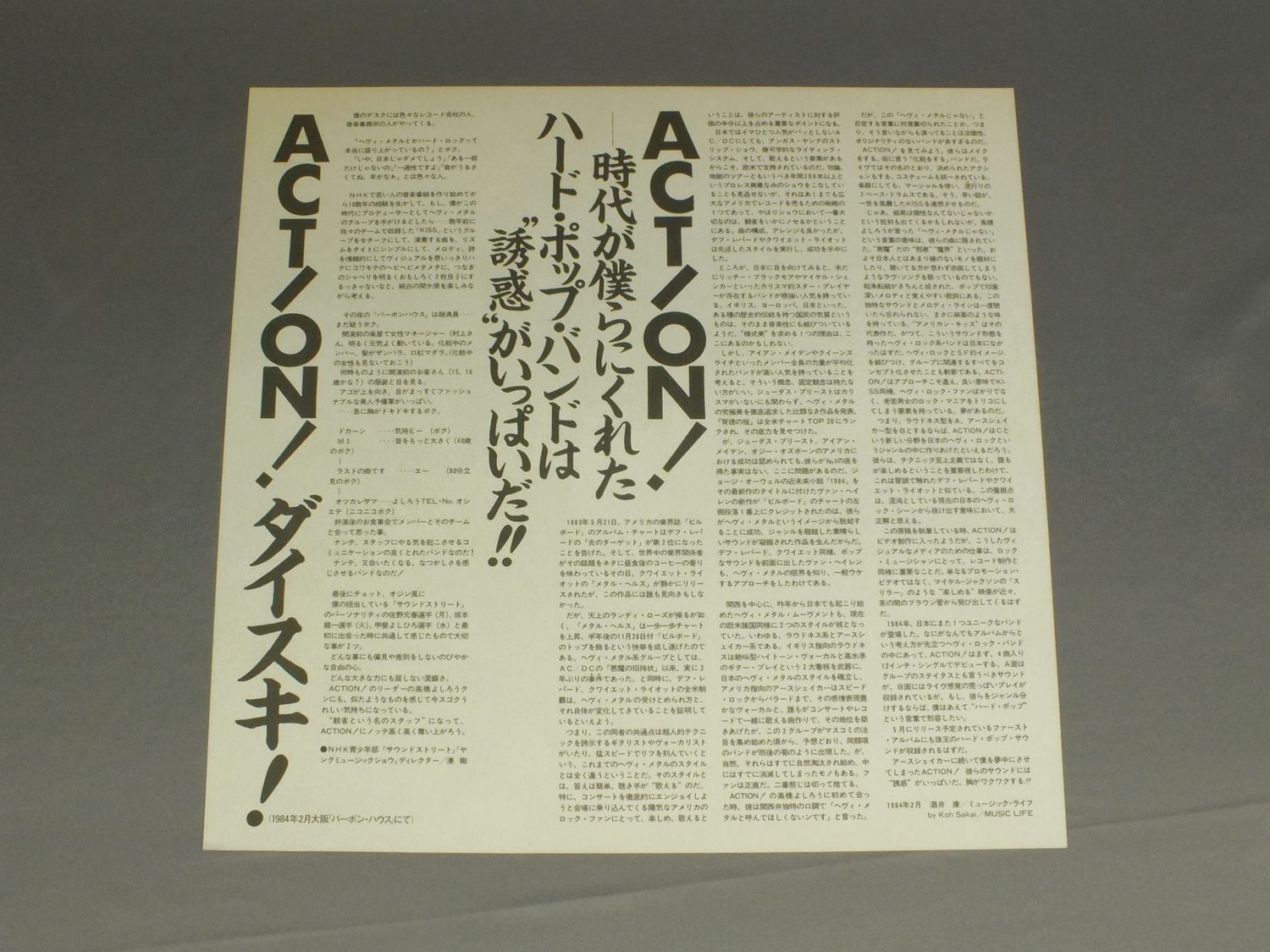 ACTION/ACTION KIT 20PL41 製造国:日本盤 / Media:12inch外観:EX+盤の状態:EX+ 価格(税込):¥770 送料 7inch:定形外郵便 360円~LP:定形外郵便 660円~送料は、注文の最終画面で確認頂けます。 > > ACTION/ACTION KIT 外観 (EX+)特記事項:特記なし。外観EX+の共通説明:中古としては美品、一見してきれいでダメージが軽微。シミ、ヨゴレ、スレ有っても僅か~少し。 盤の状態 (EX+)特記事項:極薄いスリキズ・スレ少し。一見してきれいな状態です。盤EX+の共通説明:盤面の極薄いスリキズ、スレ少し程度 音に出そうなものは無いように見える(極軽微なソフトティック音は除く)。 Tweet それぞれの画像をクリックすると、大きい写真が見られます こちらの商品もお勧めです 1,210円 PANTA & HALパンタ&HAL / TKO NIGHT LIGHT 2,750円 LAUGHIN` NOSEラフィン・ノーズ / LIVE BLACK BOXLIVE BLACK BOX 660円 BOW WOW / WARNING FROM STARDUST 1,650円 NICOTINEニコチン / CARNIVAL未開封 770円 COOLSクールス / ROCK`N`ROLL ANGELSロックン・ロール・エンジェルス 1,210円 LOUDNESSラウドネス / RISKY WOMANリスキー・ウーマン 1,320円 EARTH SHAKER / MIDNIGHT FLIGHT 990円 44 MAGUNAM44 マグナム / DANGER MONEY