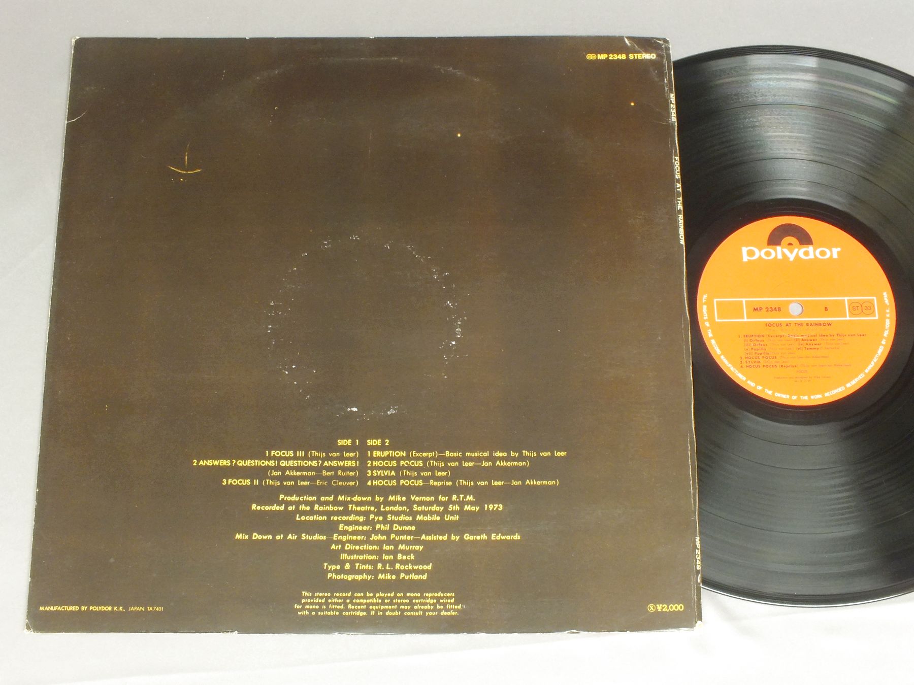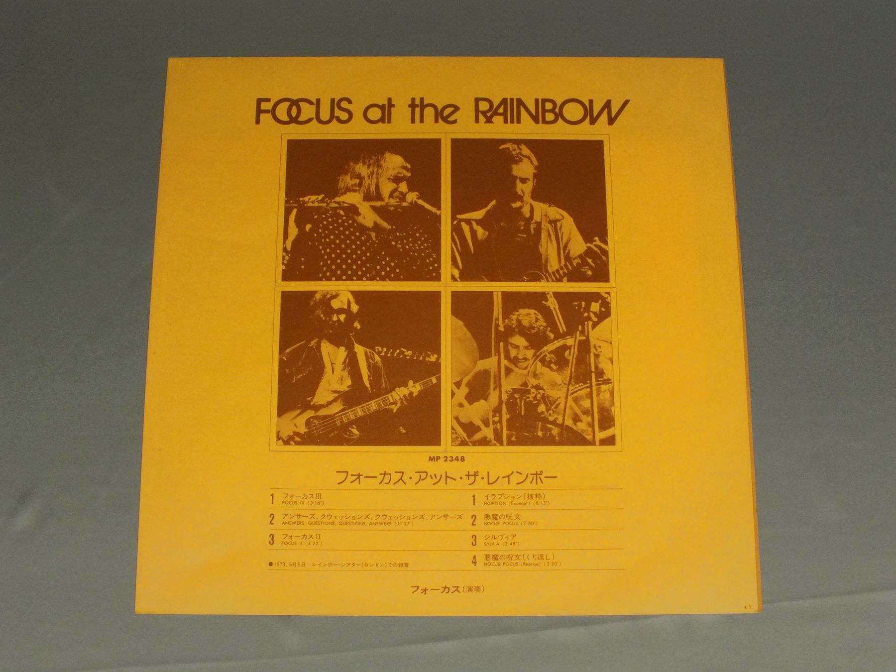 FOCUS/FOCUS AT THE RAINBOW MP2348 製造国:日本盤 / Media:LP外観:EX盤の状態:EX+ 価格(税込):¥1,650(売約済) 送料 7inch:定形外郵便 360円~LP:定形外郵便 660円~送料は、注文の最終画面で確認頂けます。 > > FOCUS/FOCUS AT THE RAINBOW 外観 (EX)特記事項:変形ジャケ。背側の上角でヨレ多少有り。薄いレコードリングスレ等スレ軽は多少有りますが、全体的に大きなスレやスリキズなどはあまり無い感じ。見開きもあまりスレ無く色合いもしっかりした状態。解説カード付。外観EXの共通説明:ダメージが限定的。中古品としては保存状態がよい方。シミ、ヨゴレ、スレ 少し~軽度。 盤の状態 (EX+)特記事項:極薄いスリキズ、スレ少しだけ。一見して綺麗な状態です。盤EX+の共通説明:盤面の極薄いスリキズ、スレ少し程度 音に出そうなものは無いように見える(極軽微なソフトティック音は除く)。 Tweet それぞれの画像をクリックすると、大きい写真が見られます こちらの商品もお勧めです 1,210円 VANGELISヴァンゲリス / ALBEDO 039反射率 039 770円 EMERSON LAKE & PALMERエマーソン・レイク&パーマー / PICTURES AT AN EXHIBITION展覧会の絵 770円 ASIAエイジア / ALFHAアルファ 1,210円 RICK WAKEMANリック・ウェイクマン / JOURNEY TO THE CENTER OF THE EARTH地底探検 ライブ 1,210円 EMERSON. LAKE & PALMERエマーソン・レイク & パーマー / PICTURES AT AN EXHIBITION展覧会の絵 770円 MIKE OLDFIELDマイク・オールドフィールド / KILLING FIELDSキリング・フィールド 880円 RICK WAKEMANリック・ウェイクマン / JOURNEY TO THE CENTRE OF THE EARTH地底探検 2,420円 MOODY BLUES PROCOL HARUM etc / SPECIAL DIGEST PROMO ONLYWE GOT ROCKシリーズ スペシャル・ダイジェスト盤 非売品