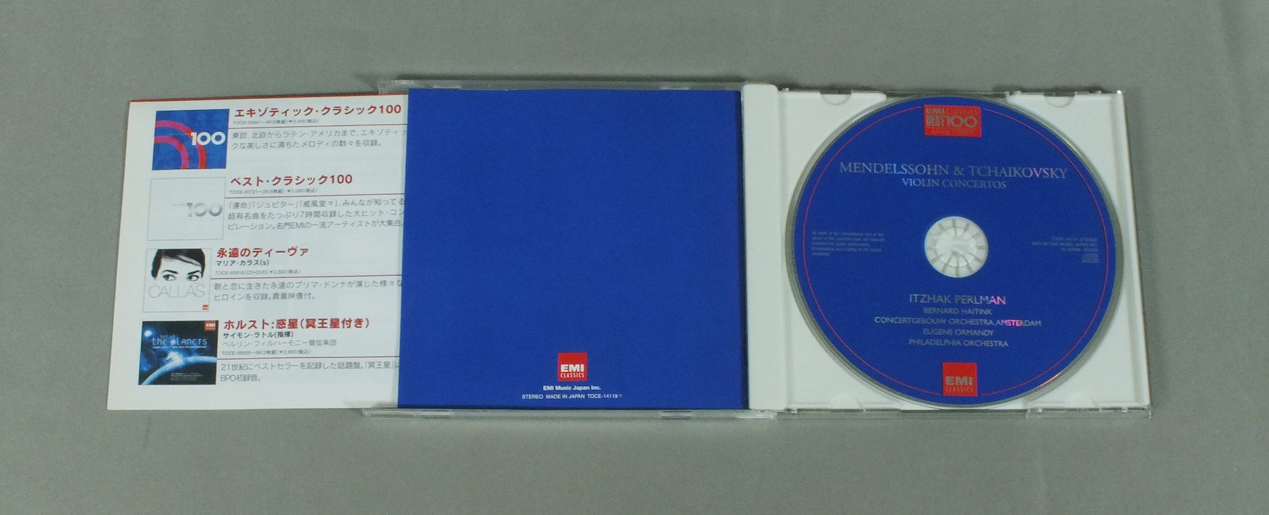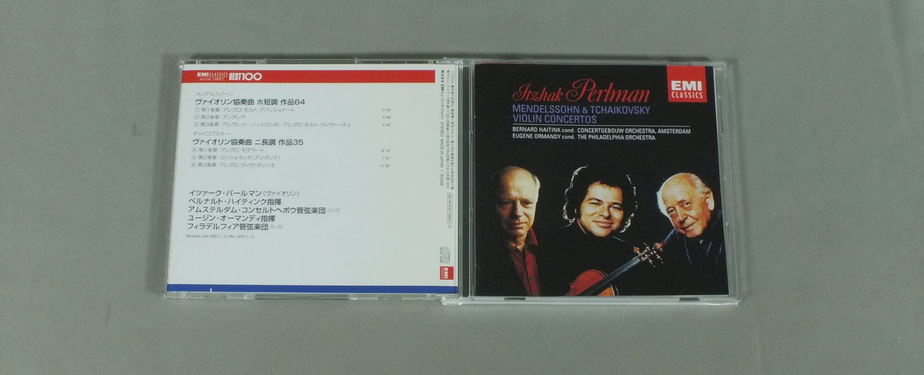 PERLMAN - HAITINK - ORMANDYパールマン - ハイティンク - ユージン・オーマンディ/MENDELSSOHN & TCHAIKOVSKY - VIOLIN CONC.Sパールマン メンデルスゾーン&チャイコフスキー - ヴァイオリン協奏曲 TOCE14119 製造国:日本盤 / Media:CD外観:EX+盤の状態:EX 価格(税込):¥1,650 送料 7inch:定形外郵便 360円~LP:定形外郵便 660円~送料は、注文の最終画面で確認頂けます。 > > PERLMAN - HAITINK - ORMANDY/MENDELSSOHN & TCHAIKOVSKY - VIOLIN CONC.S 外観 (EX+)特記事項:ヨレ、スレ少々。ヨゴレなども少しだけできれいな感じです。外観EX+の共通説明:中古としては美品、一見してきれいでダメージが軽微。シミ、ヨゴレ、スレ有っても僅か~少し。 盤の状態 (EX)特記事項:薄いスリキズが軽く有ありますが、軽微な感じ。盤EXの共通説明:盤面のスリキズが薄いものが少し~軽度 音に出そうなものは無いように見える(軽微なソフトティック音は除く)。 Tweet それぞれの画像をクリックすると、大きい写真が見られます こちらの商品もお勧めです 990円 STOKOVSKI - RCA SYMPHONY ORCHESTRAストコフスキー - RCA交響楽団 / LISZT - HUNGARIAN RHAPSODYリスト - ハンガリー狂詩曲 2,200円 BOULT + LONDON PHILHARMONIC ORCHESTRA / VAUGHAN WILLIAMS - THE NINE SYMPHONIES 9 LP BOX 2,860円 JOCHUM - CHOR UND ORCHESTER DES BAYERISCHEN RUNDFUNKSヨッフム - バイエルン放送交響楽団 / HAYDN - MISSA SANCTAE CAECILIAEハイドン - チェチリアのミサ 1,540円 BOHM - BERLINER PHILHARMONIKERベーム - ベルリン・フィル / R.STRAUSS - TILL EULENSPIEGELリヒャルト・シュトラウス - ティル・オイレンシュピーゲルの愉快ないたずら 990円 BRENDEL - MARRTNER - ACADEMY OF ST.MARTIN IN THE FIELDSブレンデル - マリナー - アカデミー室内管弦楽団 / MOZRT - PIANO CONCERTOS NO19 NO23モーツァルト - ピアノ協奏曲第19番23番 1,540円 ABBADO - VIENER PHILHARMONIKERアバド - ウィーン・フィル / BRAHMS - HANGARIAN DANCESブラームス - ハンガリア舞曲 990円 REINER - CHICAGO SYMPHONY ORCHESTRAライナー - シカゴ交響楽団 / BARTOK - MUSIC FOR STRINGS PERCUSSION AND CELESTAバルトーク - 弦楽器と打楽器とチェレスタのための音楽 1,540円 LAWRENCE FOSTER - HOUSTON SYMPHONY ORCHESTRAローレンス・フォスター - ヒューストン交響楽団 / PAUL CHIHARA - SYMPHONY IN CELEBRATIONポール・チハラ - SYMPHONY IN CELEBRATION