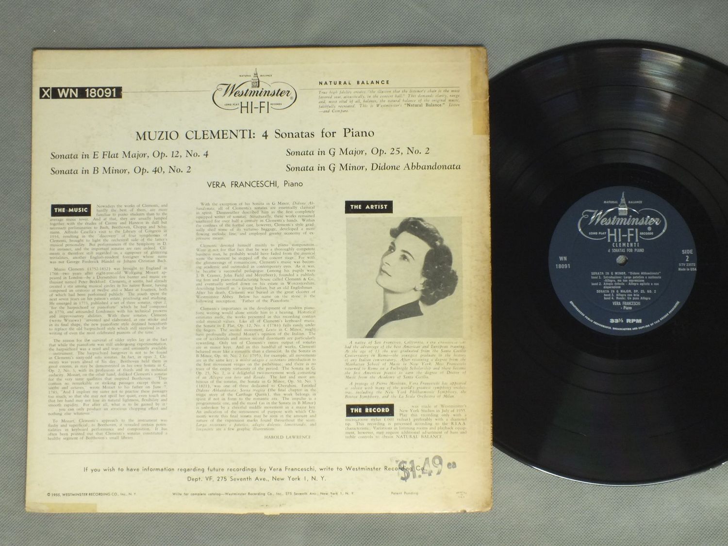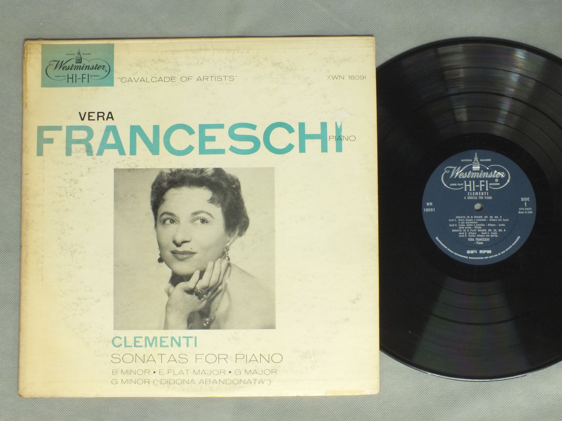 VERA FRANCESCHI/CLEMENTI - 4 SONATS FOR PIANO XWN18091 製造国:米国盤 / Media:LP外観:VG+盤の状態:EX+ 価格(税込):¥1,320(売約済) 送料 7inch:定形外郵便 360円~LP:定形外郵便 660円~送料は、注文の最終画面で確認頂けます。 > > VERA FRANCESCHI/CLEMENTI - 4 SONATS FOR PIANO 外観 (VG+)特記事項:背スレ有り。表ジャケに剥がれ。ジャケ表面にシミやよごれ有り。底ヘリに割れやテープ補修。外観VG+の共通説明:ダメージやや有り。シミ、ヨゴレ、スレなど多少~やや多め。 盤の状態 (EX+)特記事項:極薄いスリキズ・スレ少し。一見してきれいな状態です。盤EX+の共通説明:盤面の極薄いスリキズ、スレ少し程度 音に出そうなものは無いように見える(極軽微なソフトティック音は除く)。 Tweet それぞれの画像をクリックすると、大きい写真が見られます こちらの商品もお勧めです 990円 LEONARD PENNARIO / ROMANTIC CHOPIN 990円 LUDWIG HOFFMANNルードウィヒ・ホフマン / CHOPIN PIANO FAVOURITESショパン ピアノ小曲集 1,210円 HOROWITZ / SOUND OF HOROWITZ 990円 GTTFRIED HECHTL - BEATRIZ KLIEN / MORZART - 6 SONATAS FOR FLUTE 990円 ESCHENBACH / MOZART-KLAVIERSONATEN KV333 1,650円 ASHKENAZY / MUSSORGSKY PICTURERS AT AN EXHIBITION 1,980円 FISCHER / MORZART - SONATES NO10 & 11 1,210円 LAZAR BERMAN / LIVE AT CARNEGIE HALL 1979 ( CBS MASTER SOUND )