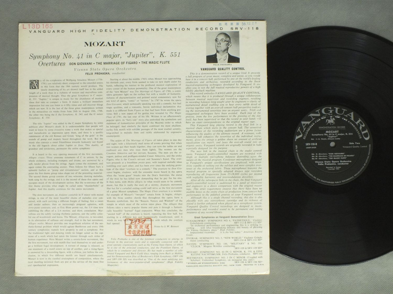 F.PROHASKA/MOZART - SYM. NO41 JUPITER etc SRV118 製造国:米国盤 / Media:LP外観:VG+盤の状態:EX 価格(税込):¥1,320(売約済) 送料 7inch:定形外郵便 360円~LP:定形外郵便 660円~送料は、注文の最終画面で確認頂けます。 > > F.PROHASKA/MOZART - SYM. NO41 JUPITER etc 外観 (VG+)特記事項:ステッカーやスタンプ有り外観VG+の共通説明:ダメージやや有り。シミ、ヨゴレ、スレなど多少~やや多め。 盤の状態 (EX)特記事項:薄いスリキズ・スレ軽くある感じ。軽微なものの様子です。盤EXの共通説明:盤面のスリキズが薄いものが少し~軽度 音に出そうなものは無いように見える(軽微なソフトティック音は除く)。 Tweet それぞれの画像をクリックすると、大きい写真が見られます こちらの商品もお勧めです 1,430円 SCHURICHT-MONTEUX / SCHUBERT-UNFINISHED SYM. 990円 FERENCSIK / BALLET MUSIC KODALY SYM. 990円 HERRMANN / VES SYM. 2 990円 HANS STADLMAIR / HAYDN - 2 CONC.S etc 1,650円 BOHM / STRAUSS-ELEKTRA 1,760円 IGOR SHUKOW / TSCHAIKOWSKY KLAVIERSONATE OP37 SOUVENIR DE HAPSAL 2,420円 BOHM / STRAUSS - ARIADNE AUF NAXOSR.シュトラウス - ナクソス島のアリアドネ 990円 KARAJAN / BEETHOVEN-SYM. C-MOLL