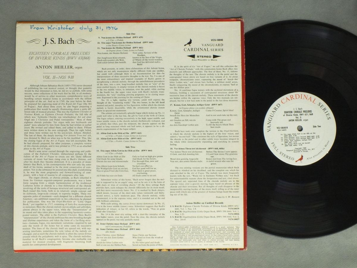 ANTON HEILLER/BACH - EIGHTEEN CHORALE PRELUDES VCS10040 製造国:米国盤 / Media:LP外観:EX-盤の状態:EX+ 価格(税込):¥1,320(売約済) 送料 7inch:定形外郵便 360円~LP:定形外郵便 660円~送料は、注文の最終画面で確認頂けます。 > > ANTON HEILLER/BACH - EIGHTEEN CHORALE PRELUDES 外観 (EX-)特記事項:背スレやヘリスレ有り。レコーフォリングスレ有り。裏ジャケ側に書込み。外観EX-の共通説明:ダメージ軽度~多少。 中古品としては普通の状態。シミ、ヨゴレ、スレなど軽く~多少。 盤の状態 (EX+)特記事項:薄いスリキズ・スレ少し。一見してきれいな状態です。盤EX+の共通説明:盤面の極薄いスリキズ、スレ少し程度 音に出そうなものは無いように見える(極軽微なソフトティック音は除く)。 Tweet それぞれの画像をクリックすると、大きい写真が見られます こちらの商品もお勧めです 990円 SCHNEIDER-SERKIN / SCHUBERT-LAS SONATAS PARA VIOLIN PIANO 2,640円 CORTOT THIBAUD CASSALS / SCHUBERT-HAYDN TRIOS 1,430円 FERNANDO LOZANO / DANIEL BOURGUE-ORCHESTRE LYRIQUE DE RADIO FRANCE 1,320円 TRIO CALAMUSトリオ・カラムス / DEVIENNE - SONATE POUR FLUTE BASSON ET PIANO(AUTOGRAPHED)ドゥヴィエンヌ - フルートとファゴットとピアのためのソナタ(サイン付) 990円 MARRINER / VIVALDI BLASERKONZERTE VOL2 770円 GALWAY/CAMDEN/GEORGIADIS/HAWKINS -CCUMMINGS / LONDON VIRTUOSI VOL 1 770円 JORG EWAL DAHLER / HANDEL`S FLUTE SONATAS 990円 PAILLARD / DVORAK & TCHAIKOVSKY-TWO SERENADES FOR STRINGS