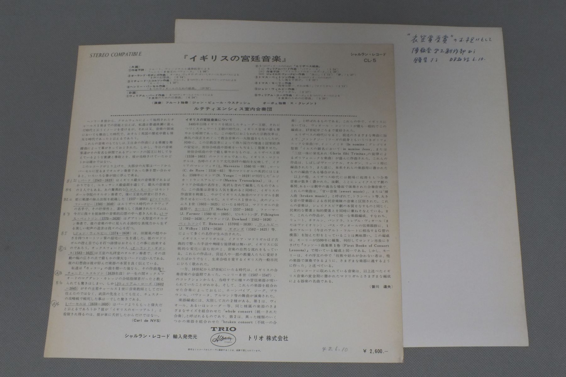 LUTETIENSISルテティエンシィス室内合奏団/MUSIQUE A LA COUR D`ANGLETERREイギリスの宮廷音楽 CL-5 製造国:仏盤 / Media:LP外観:EX-盤の状態:EX- 価格(税込):¥1,320(売約済) 送料 7inch:定形外郵便 360円~LP:定形外郵便 660円~送料は、注文の最終画面で確認頂けます。 レコード検索 > > LUTETIENSIS/MUSIQUE A LA COUR D`ANGLETERRE 外観 (EX-)特記事項:ジャケ表面にシミやよごれ有り。背スレやヘリスレ有り。外観EX-の共通説明:ダメージ軽度~多少。 中古品としては普通の状態。シミ、ヨゴレ、スレなど軽く~多少。 盤の状態 (EX-)特記事項:薄いスリキズ・細かい表面スレ軽くある感じ。全体的には殆どが軽微なものの様子です。盤EX-の共通説明:盤面のスリキズが多少有り。音に出そうなものは殆ど無いように見える~さほど気にならないぐらいの軽いプチ数カ所程度。 Tweet それぞれの画像をクリックすると、大きい写真が見られます こちらの商品もお勧めです 1,650円 WILHELM EHMANN / BACH SCHWINGT FREUDIG EUCH EMPOR 990円 MUNROW / GUILLAUME DUFAY MISSA SE LA FACE AY PALE 990円 MITCHEL PIGUET - RICERCARE-ENSEMBLEビゲ - チューリッヒ・リチェルカーレ古楽アンサンブル / LUDWIG SENFL - DEUTSCHE LIEDERゼンフル - ドイツ歌曲の故里をたずねて 990円 VINZENZ HLADKY / MUSIC FOR MANDOLIN & GUITAR ENSEMBLE 990円 RAFAEL DRUIAN-JOHN SIMMS / IVES-SONATAS FOR VIOLIN&PIANO 1,320円 HARNONCOURT / BACH-VIOLINKONZERTE 1,320円 SALZBURG MOZART TRIO / MOZART-THE SIX PIANO TRIOS 2,640円 MUNCHINGER / MOZART LES PETITS RIENS