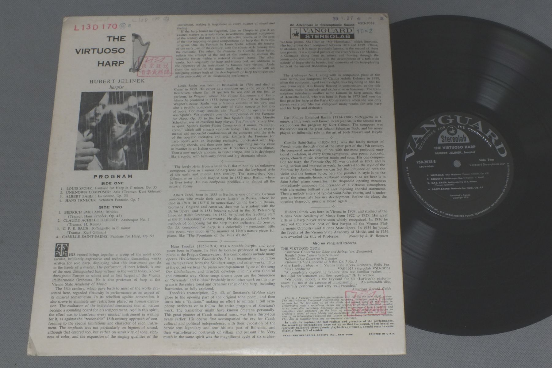 HUBERT JELINEK/VIRTUOSO HARP VSD 2038 製造国:米国盤 / Media:LP外観:VG+盤の状態:EX 価格(税込):¥1,320(売約済) 送料 7inch:定形外郵便 360円~LP:定形外郵便 660円~送料は、注文の最終画面で確認頂けます。 > > HUBERT JELINEK/VIRTUOSO HARP 外観 (VG+)特記事項:ジャケ表面にステッカーやスタンプ。外観VG+の共通説明:ダメージやや有り。シミ、ヨゴレ、スレなど多少~やや多め。 盤の状態 (EX)特記事項:薄いスリキズ・スレ軽くある感じ。軽微なものの様子です。盤EXの共通説明:盤面のスリキズが薄いものが少し~軽度 音に出そうなものは無いように見える(軽微なソフトティック音は除く)。 Tweet それぞれの画像をクリックすると、大きい写真が見られます こちらの商品もお勧めです 1,870円 YVES NAT / SCHCBERT MOMENTS MUSICAUX 990円 GIESKING-VON KARAJAN / BEETHOVEN EMPEROR CONC. 1,210円 ALBERT SCHWEITZER / FRANCK - CHORALE NO1- 3 990円 JEAN PIERRE RAMPAL / BACH-THE COMPLETE FLUTE SONATAS 990円 IRIS LOVERIDGE / BAX - PIANO MUSIC-VOLUME3 990円 ASHKENAZY / CHOPIN-FOUR BALLADES & TROIS NOUVELLES ETUDES 1,870円 WALCHA / BACH TOCCATA UND FUGUE 990円 VASARY-KEMPFF / TRAUMEREI-DIE SCHONSTEN