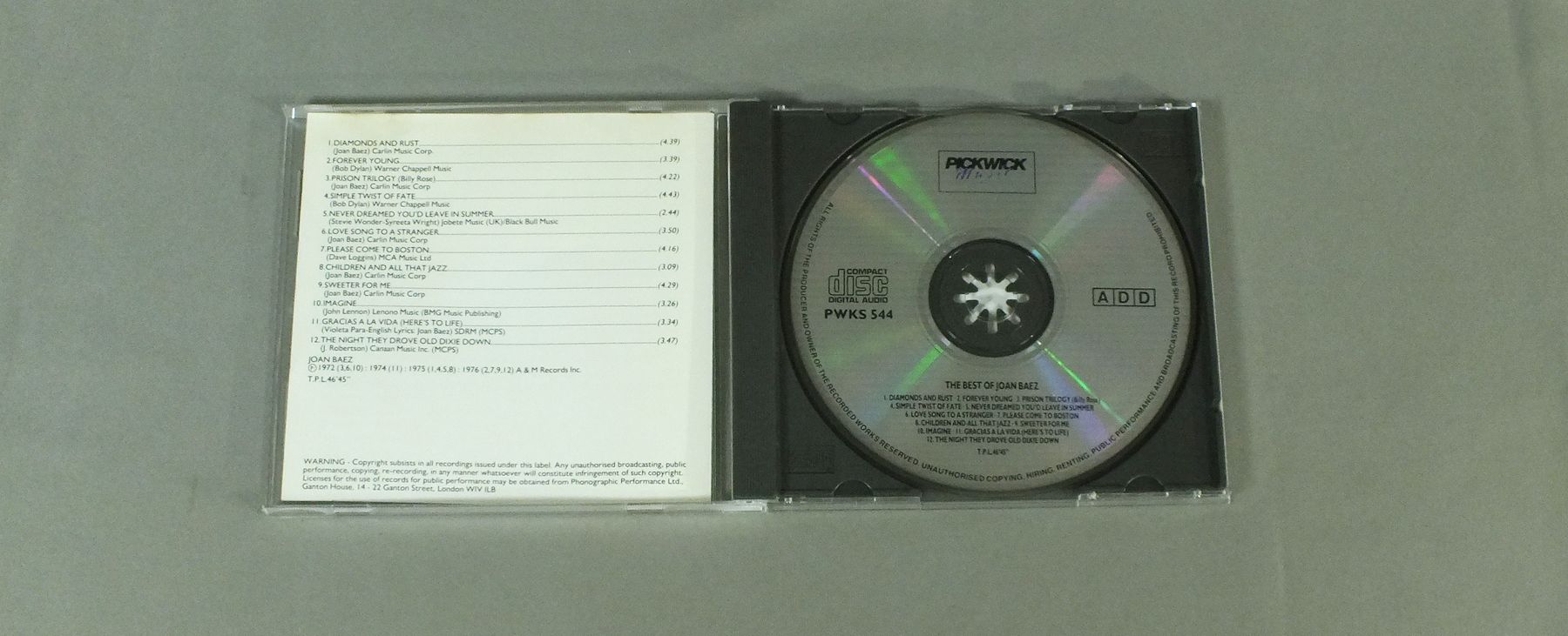 JOAN BAEZジョーン・バエズ/BEST OF JOAN BAEZ PWKS544 製造国:英国盤 / Media:CD外観:EX盤の状態:EX+ 価格(税込):¥1,100 送料 7inch:定形外郵便 360円~LP:定形外郵便 660円~送料は、注文の最終画面で確認頂けます。 レコード検索 > FOLK > JOAN BAEZ/BEST OF JOAN BAEZ 外観 (EX)特記事項:ヨレ、スレ、シミなど小 - 軽度です。外観EXの共通説明:ダメージが限定的。中古品としては保存状態がよい方。シミ、ヨゴレ、スレ 少し~軽度。 盤の状態 (EX+)特記事項:微細なスリキズが少々。きれいな感じの盤面です。盤EX+の共通説明:盤面の極薄いスリキズ、スレ少し程度 音に出そうなものは無いように見える(極軽微なソフトティック音は除く)。 Tweet それぞれの画像をクリックすると、大きい写真が見られます こちらの商品もお勧めです