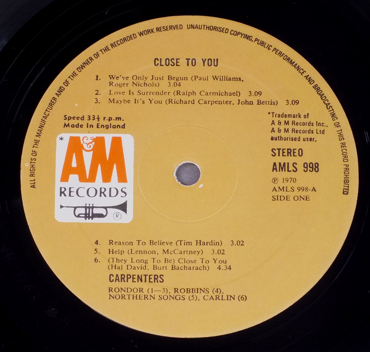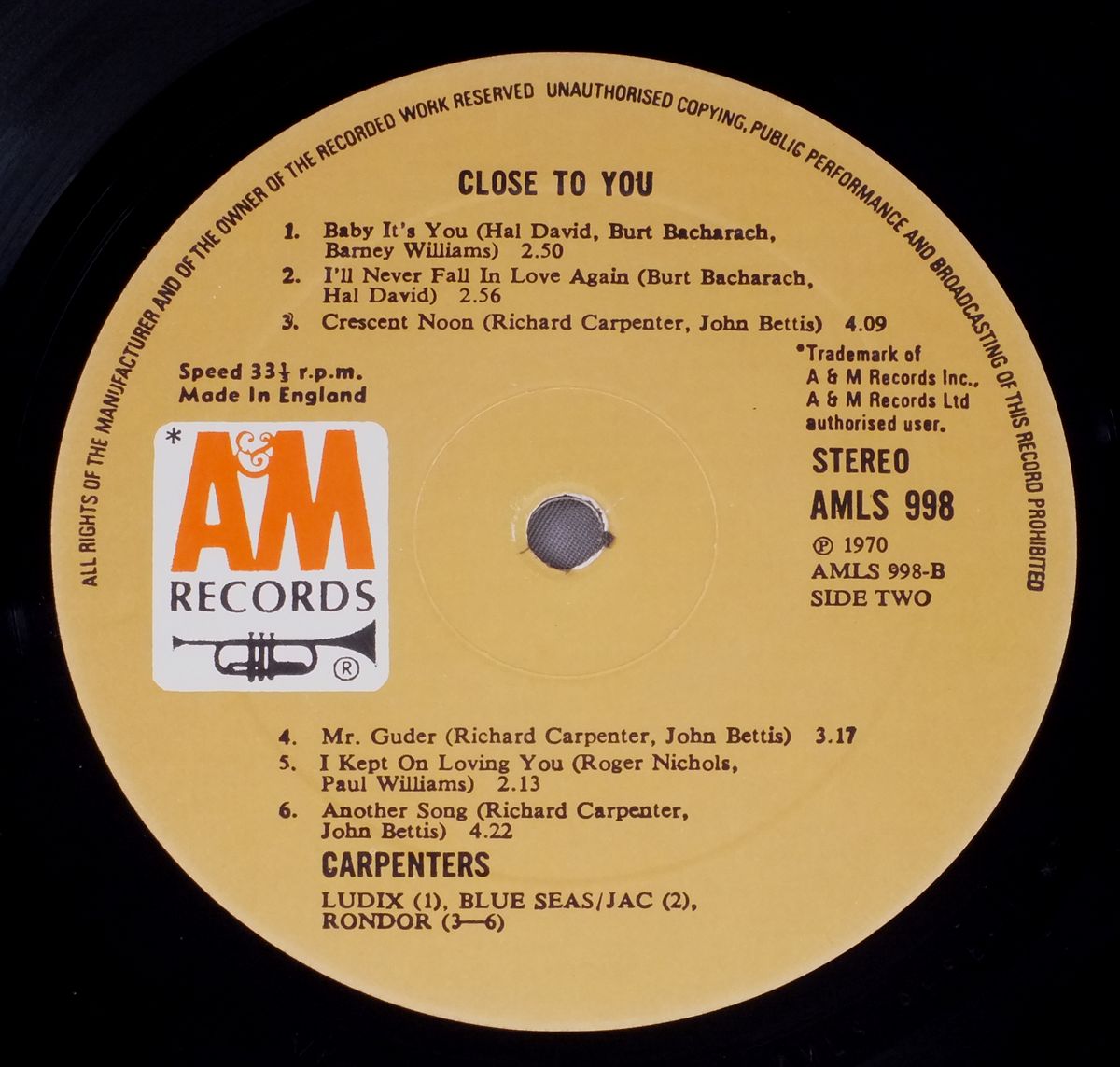 CARPENTERS/CLOSE TO YOU AMLS998 製造国:英国盤 / Media:LPMatrix:A-2*X B-1*T外観:EX盤の状態:EX 価格(税込):¥4,400(売約済) 送料 7inch:定形外郵便 360円~LP:定形外郵便 660円~送料は、注文の最終画面で確認頂けます。 レコード検索 > ALL Genre > CARPENTERS/CLOSE TO YOU 外観 (EX)特記事項:表裏ジャケ共に厚手のコーティング仕様。背付近に短いコーティングシワや浮き多少。ジャケ表面は全体的にスレやスリキズ、コーティングのヨレシワ等少ないきれいな状態。外観EXの共通説明:ダメージが限定的。中古品としては保存状態がよい方。シミ、ヨゴレ、スレ 少し~軽度。 盤の状態 (EX)特記事項:薄いスリキズ・スレ軽く有る感じ。殆どが軽微なものの様子で、きれいな印象。曲間など、静かなところを中心に聴いて見ましたが、チリノイズ少ないきれいな再生具合でした。盤EXの共通説明:盤面のスリキズが薄いものが少し~軽度 音に出そうなものは無いように見える(軽微なソフトティック音は除く)。 Tweet それぞれの画像をクリックすると、大きい写真が見られます こちらの商品もお勧めです 4,950円 JONI MITCHELL / DOG EAT DOG 4,950円 SANDY DENNY / RENDEZVOUS 4,400円 JONI MITCHELL / DOG EAT DOG 7,700円 SUSAN MAUGHAN / I WANNA BE BOBBY`S GIRL 3,850円 NICO / THE END 5,060円 JONI MITCHELL / CHALK MARK IN A RAIN STORM