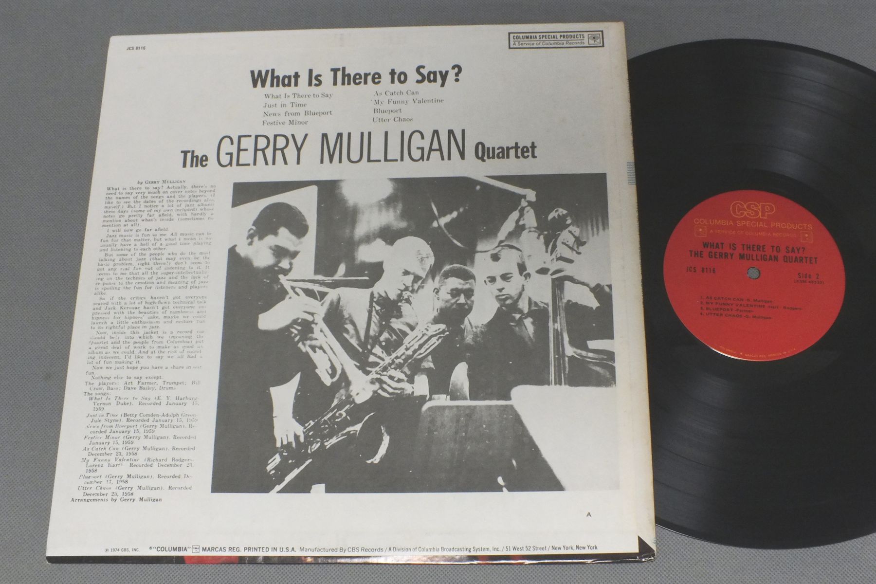 GERRY MULLIGAN QUARTET/WHAT IS THERE TO SAY? JCS 8116 製造国:米国盤 / Media:LP外観:EX盤の状態:EX+ 価格(税込):¥1,100(売約済) 送料 7inch:定形外郵便 360円~LP:定形外郵便 660円~送料は、注文の最終画面で確認頂けます。 > > GERRY MULLIGAN QUARTET/WHAT IS THERE TO SAY? 外観 (EX)特記事項:裏ジャケ側にシミ外観EXの共通説明:ダメージが限定的。中古品としては保存状態がよい方。シミ、ヨゴレ、スレ 少し~軽度。 盤の状態 (EX+)特記事項:薄いスリキズ・スレ少し。一見してきれいな状態です。盤EX+の共通説明:盤面の極薄いスリキズ、スレ少し程度 音に出そうなものは無いように見える(極軽微なソフトティック音は除く)。 Tweet それぞれの画像をクリックすると、大きい写真が見られます こちらの商品もお勧めです 880円 EVERGREEN CLASSIC JAZZ BAND / BE PREPARED FOR THE UNEXPECTED 1,540円 LOUIS NELSON ALTON PURNELL & BARRY MARTYN / IN GERMANY WITH THE WHITE EAGLE JAZZ BAND AUTOGRAPHEDIN GERMANY WITH THE WHITE EAGLE JAZZ BAND サイン付 1,650円 MONGO SANTAMARIA / MONGOMANIA 770円 DOC EVANS / DOC EVANS DIXIELAND CONCERT VOL2 440円 FRANKIE CARLE / HONKY-TONK HITS BY THE DOZEN 770円 DIZZY GILLESPIE / GILLESPIE AND THE FRIENDS 1,100円 DUKE ELLINGTON - FLETCHER HENDERSON - NBENNY CARTER / GREAT BANDS 1,980円 MODERN JAZZ QUARTET / LEGENDARY PROFILE