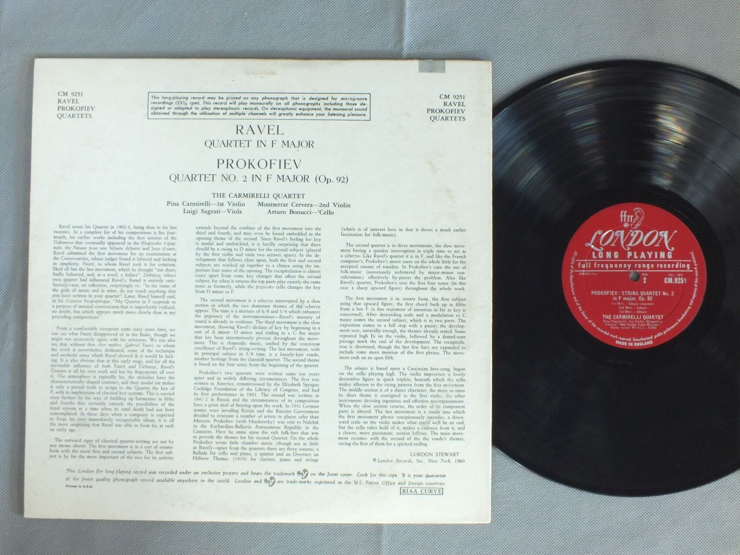 CARMIRELLI QUARTET/RAVEL-PROKOFIEV - QUARTETS CM9251 製造国:英国盤 / Media:LP外観:EX盤の状態:EX 価格(税込):¥1,320(売約済) 送料 7inch:定形外郵便 360円~LP:定形外郵便 660円~送料は、注文の最終画面で確認頂けます。 > > CARMIRELLI QUARTET/RAVEL-PROKOFIEV - QUARTETS 外観 (EX)特記事項:ジャケ表面にシミやよごれ有り。外観EXの共通説明:ダメージが限定的。中古品としては保存状態がよい方。シミ、ヨゴレ、スレ 少し~軽度。 盤の状態 (EX)特記事項:薄いスリキズ・スレ軽くある感じ。軽微なものの様子です。盤EXの共通説明:盤面のスリキズが薄いものが少し~軽度 音に出そうなものは無いように見える(軽微なソフトティック音は除く)。 Tweet それぞれの画像をクリックすると、大きい写真が見られます こちらの商品もお勧めです 990円 MAX GOBERMAN / VIVALDI-CONC. FOR STRINGS. VOL1 1,320円 PAUMGARTNER / MOZART-EINE KLEINE NACHTMUSK 1,650円 NICANOR ZABALETA / HARP CONC. HANDEL-MOZART- 1,650円 HEINZ FRIESENハインツ・フリーセン / L.MOZART-SAMTLICHE WERKE FUR HORN 990円 MARRINER / VIVALDI BLASERKONZERTE VOL2 880円 KOCIAN QUARTETコチアン四重奏団 / SMETANA - SMYCCOVY KVARTET C1 etc 1,320円 M.BIXLER-L.DAVENPORT / FOR THREE ALTO RECORDERS 1,320円 FRITZ LEHAN / HANNOVER-EINE FESTLICHE SOIREE IN HERRENHAUSEN